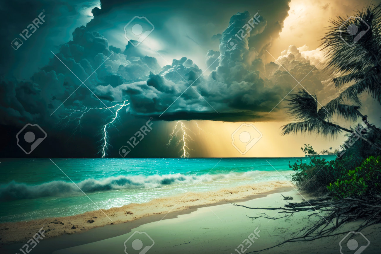 Lluvia De Verano Tropical Sobre El Mar Con Relámpagos Y Nubes De Tormenta En Rayos De Sol, Ai Generativo Fotos, retratos, imágenes y fotografía de archivo libres de derecho. Image 199063546