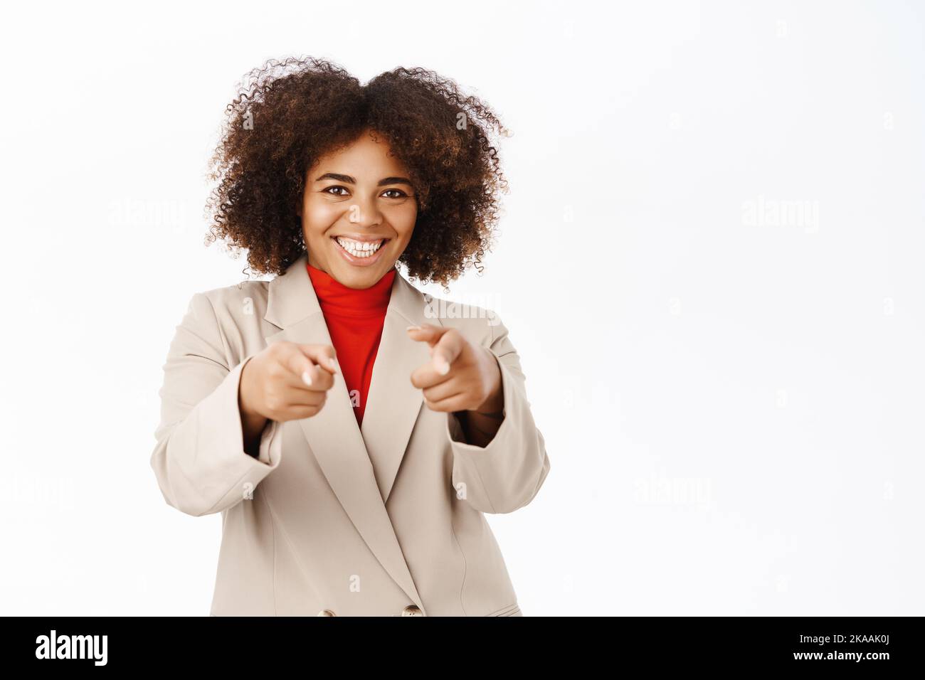 Hola, felicitaciones. Sonriente empresaria profesional, oficinista afroamericano, señalando con los dedos la cámara, invitando, alabando, de pie Fotografía de stock - Alamy