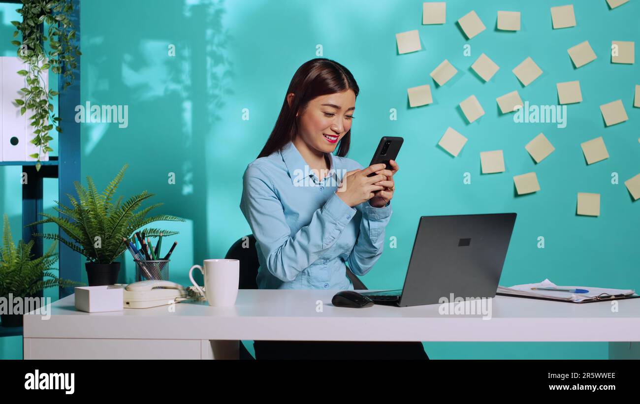 Empresaria sonriente felizmente charlando con amigos, escribiendo en el teclado del teléfono inteligente. Oficinista alegre relajado profesional en el lugar de trabajo moderno colorido sobre fondo azul del estudio Fotografía de stock -