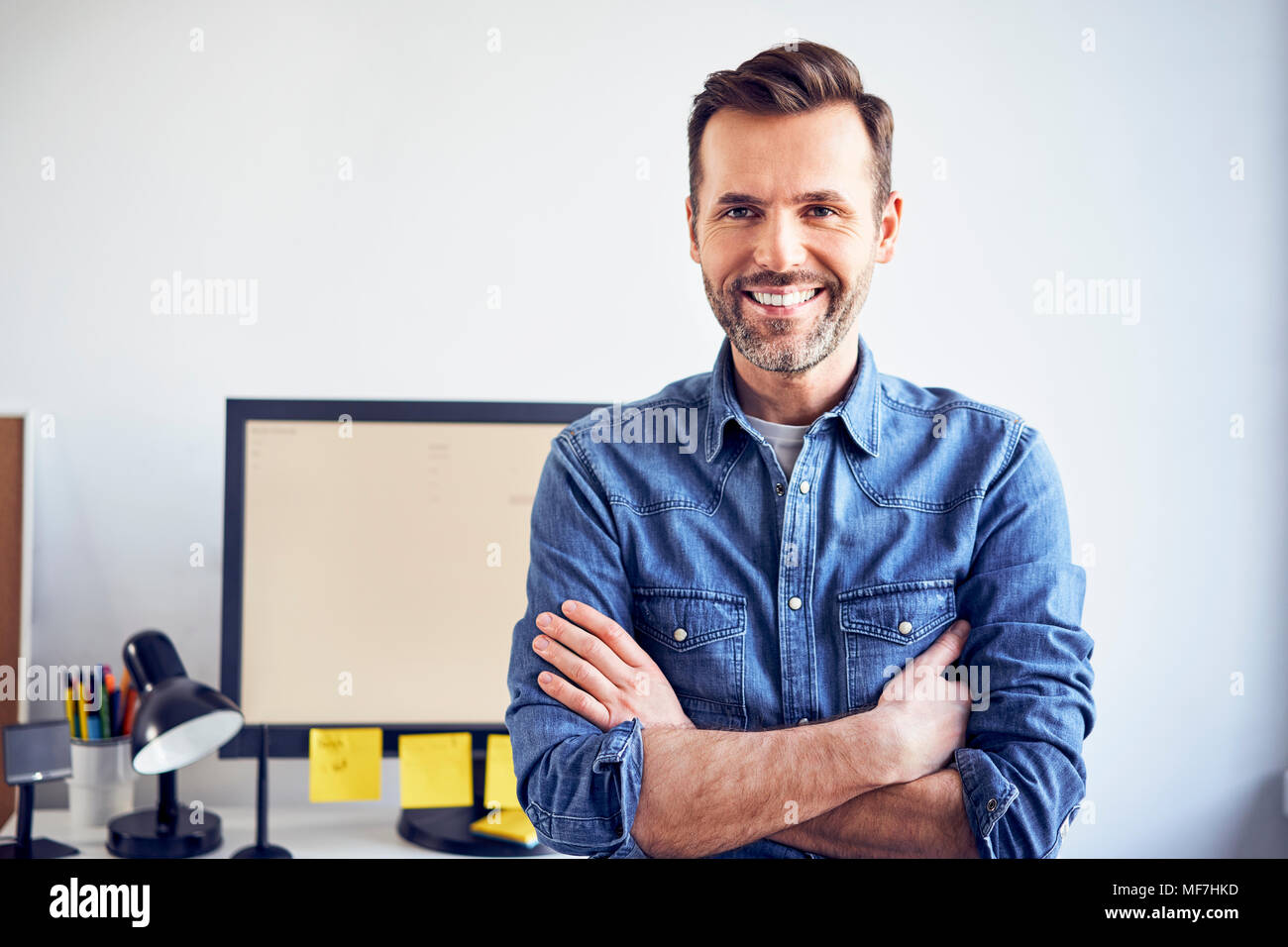 Oficinista Sonriente Posando Con Los Brazos Cruzados Y Mirando A Cámara, Interior De La Oficina En El Fondo Fotos, retratos, imágenes y fotografía de archivo libres de derecho. Image 44655768
