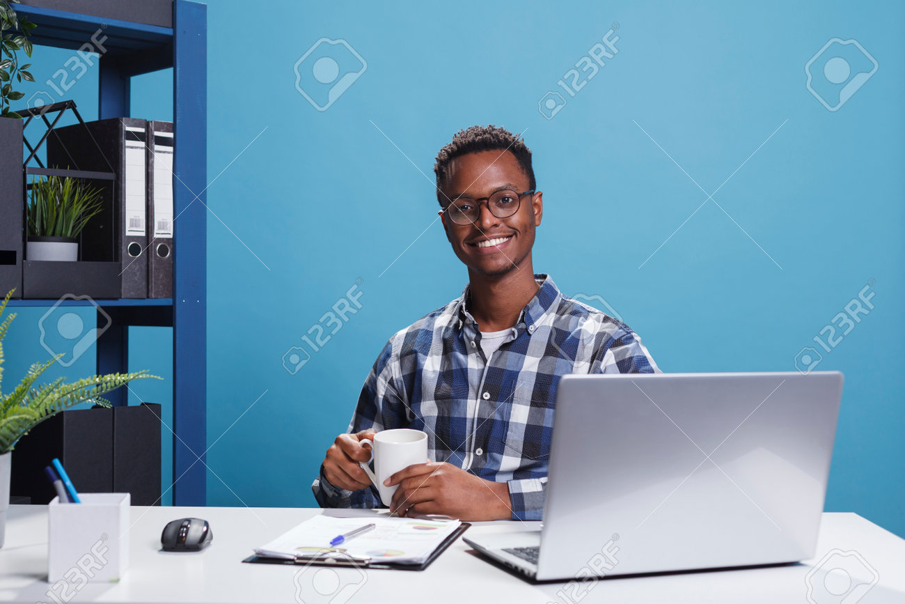Alegre Y Sonriente Oficinista Tomando Una Taza De Café Mientras Se Sienta En Un Interior Profesional. Alegre Hombre De Negocios En La Oficina De La Empresa De Investigación Sentado En El Escritorio