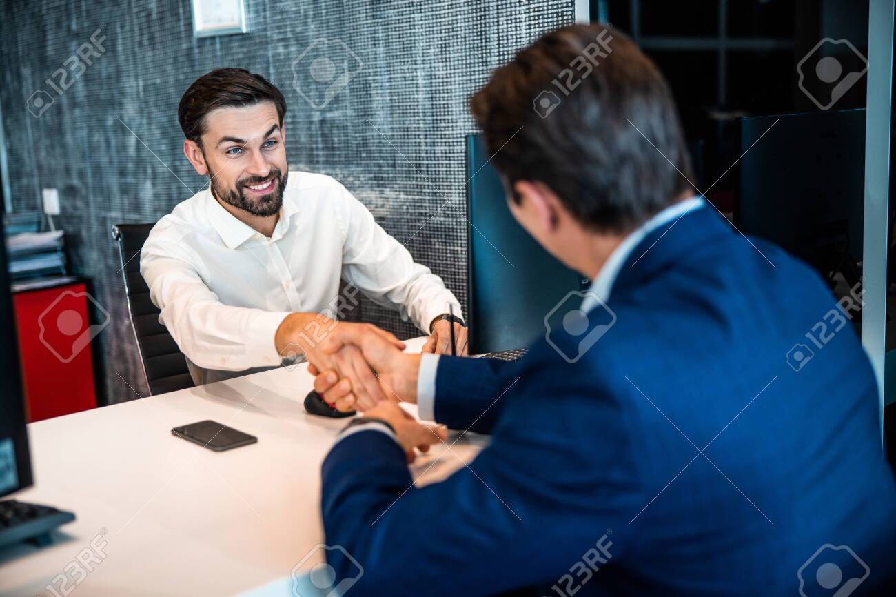 Oficinista Sonriente Estrechando La Mano De Sus Clientes Fotos, retratos, imágenes y fotografía de archivo libres de derecho. Image 142263215