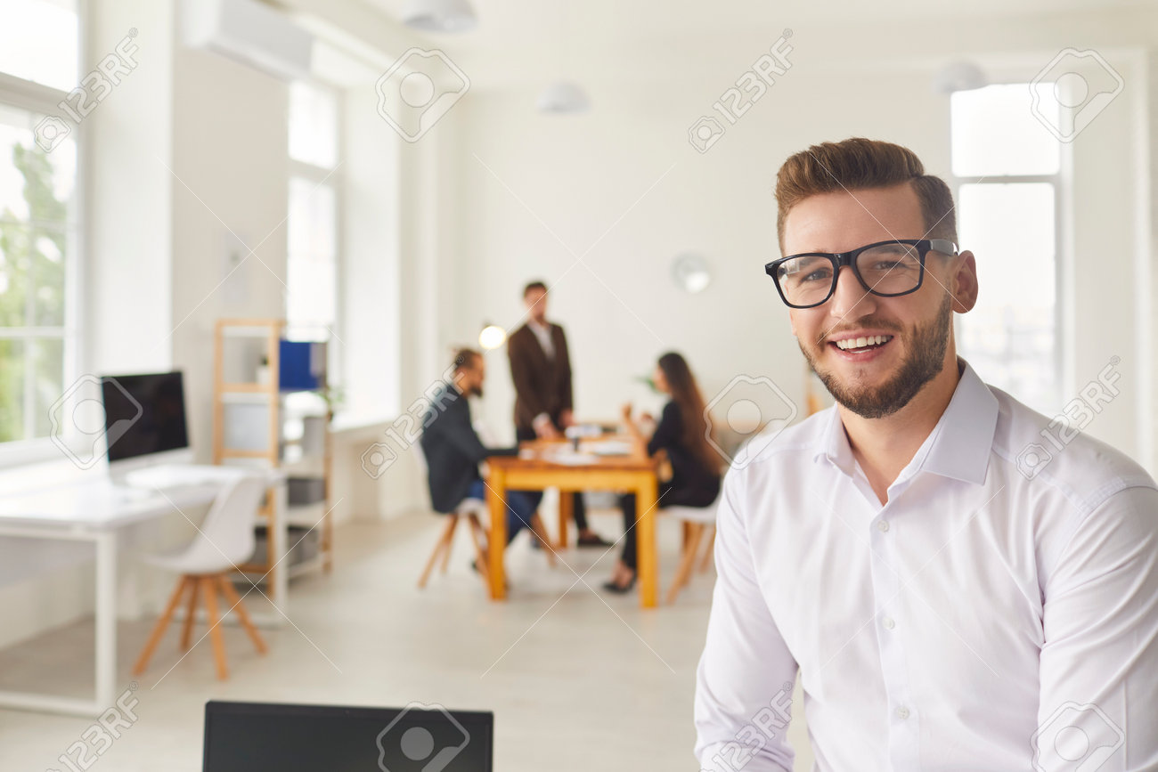 Joven Oficinista Sonriente Mirando La Cámara Con Colegas Que Tienen Una Lluvia De Ideas O Se Reúnen En Segundo Plano En El Interior De La Oficina. Trabajo En Equipo, Liderazgo, Concepto De