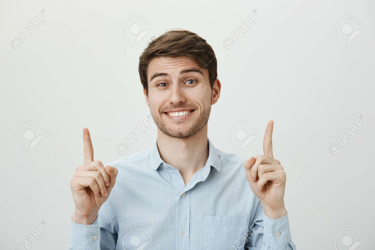 Attractive Smiling European Office Worker In Good Mood While Pointing Up With Index Fingers Or Showing Place For Copy Space. Standing Against Gray Background. Guy Describes Lengths Of Sandwich He Ate Stock