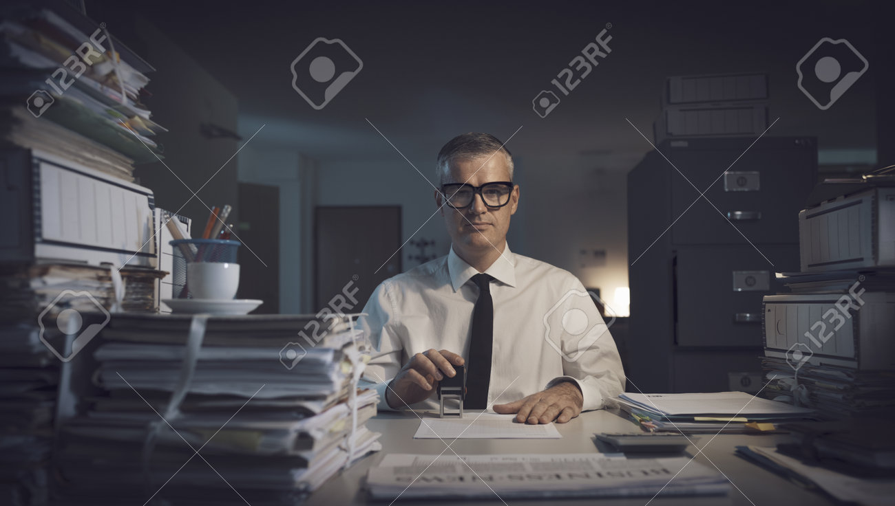 Oficinista Sonriente Sentado En El Escritorio Y Haciendo Un Trabajo Repetitivo, Está Estampando Archivos Fotos, retratos, imágenes y fotografía de archivo libres de derecho. Image 177631528