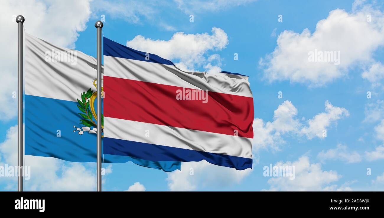 San Marino y Costa Rica ondear la bandera en el viento contra un blanco azul cielo nublado juntos. Concepto de diplomacia y relaciones internacionales Fotografía de stock - Alamy