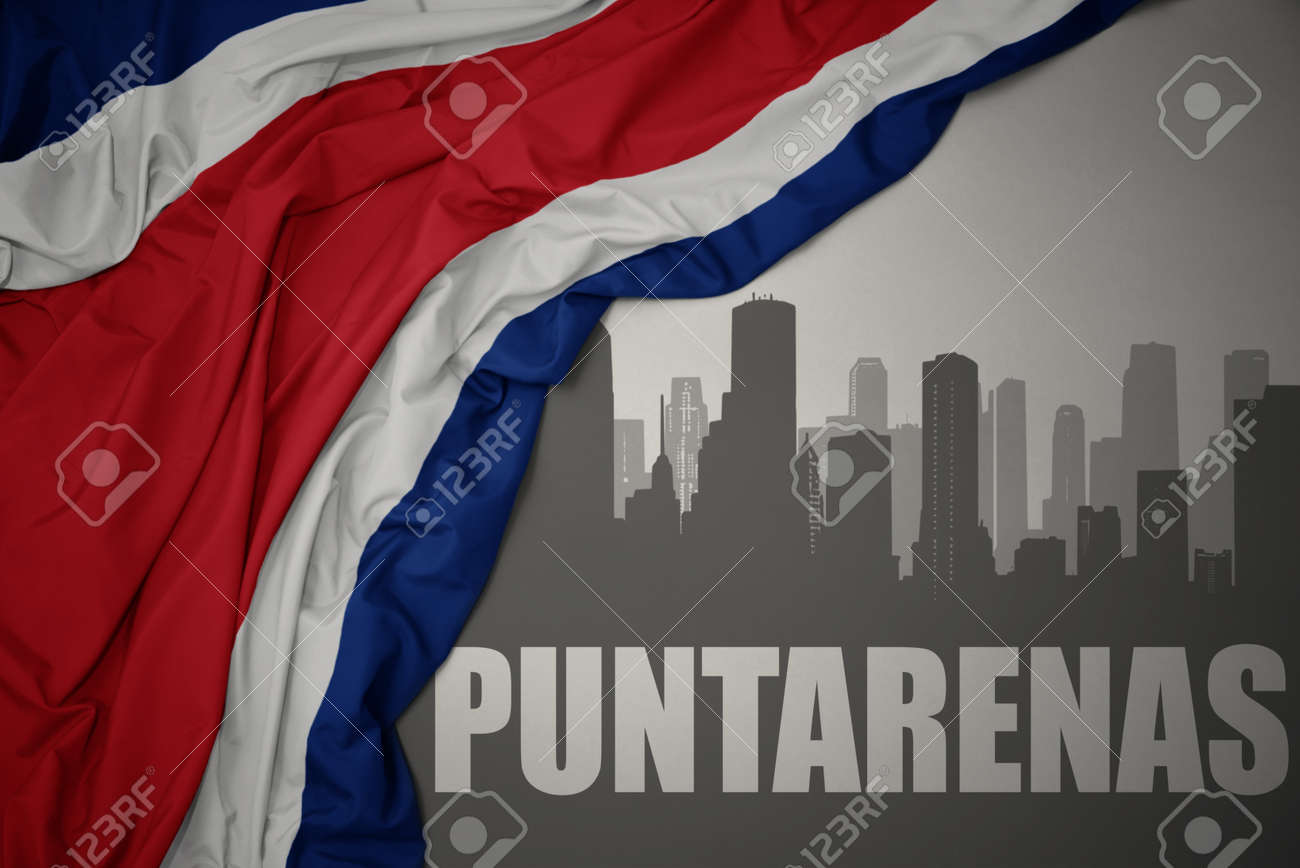 Silueta Abstracta De La Ciudad Con Texto Puntarenas Cerca De Ondear La Colorida Bandera Nacional De Costa Rica Sobre Un Fondo Gris Ilustración 3d Fotos, retratos, imágenes y fotografía de archivo libres