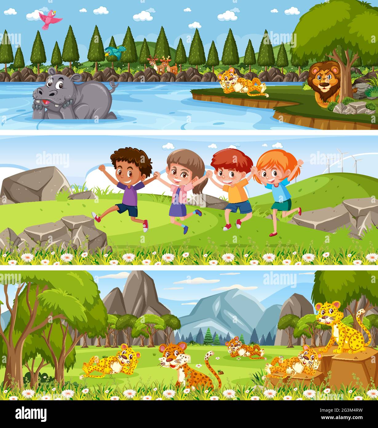 Paisaje natural diferente en escena diurna con ilustración de personajes de dibujos animados Imagen Vector de stock - Alamy