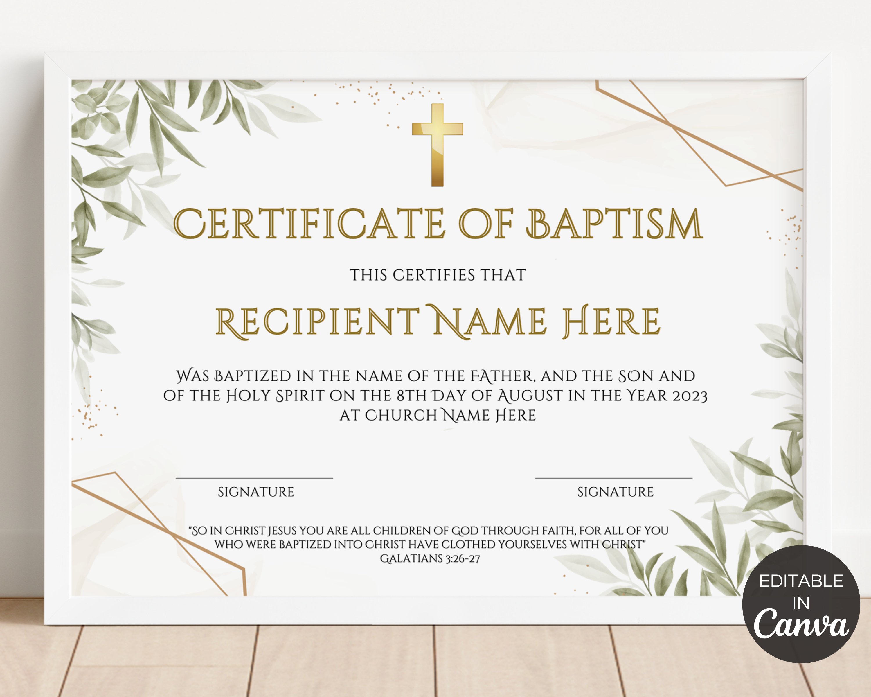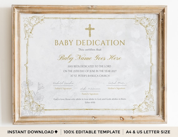 Certificado de bautismo editable, plantilla de certificado de bautismo elegante con texto de muestra y cita de las Escrituras, editar en Canva - Etsy España