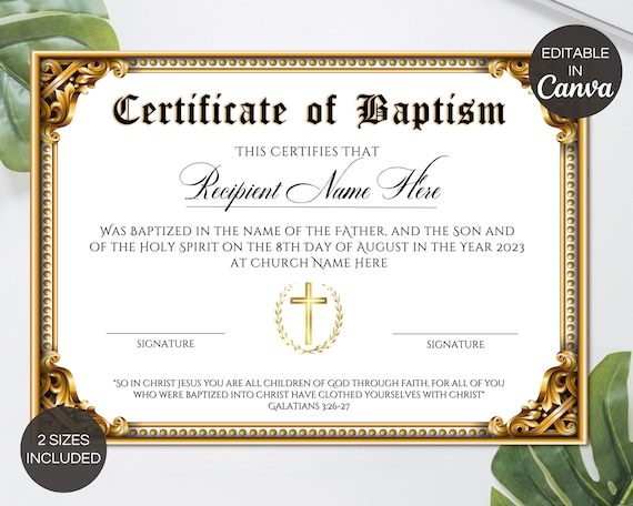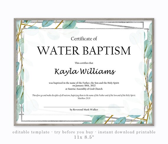 Plantilla de certificado de bautismo editable, plantilla de certificado de iglesia imprimible, descarga de plantilla de certificado de bautismo elegante - Etsy España