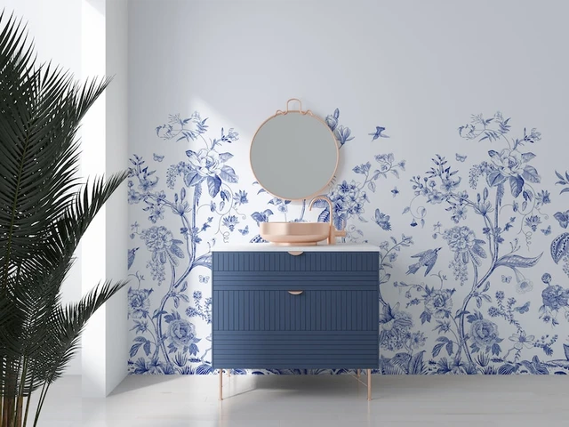 Papel pintado floral azul con diseño de Chinoiserie de acuarela, Mural de pared personalizable. Mural de inodoro moderno para baño, flores y pájaros W - AliExpress