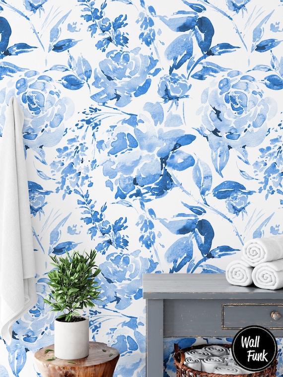 Papel pintado floral acuarela, papel pintado floral, papel pintado floral extraíble, papel pintado floral azul, papel pintado floral adhesivo temporal F15 - Etsy México
