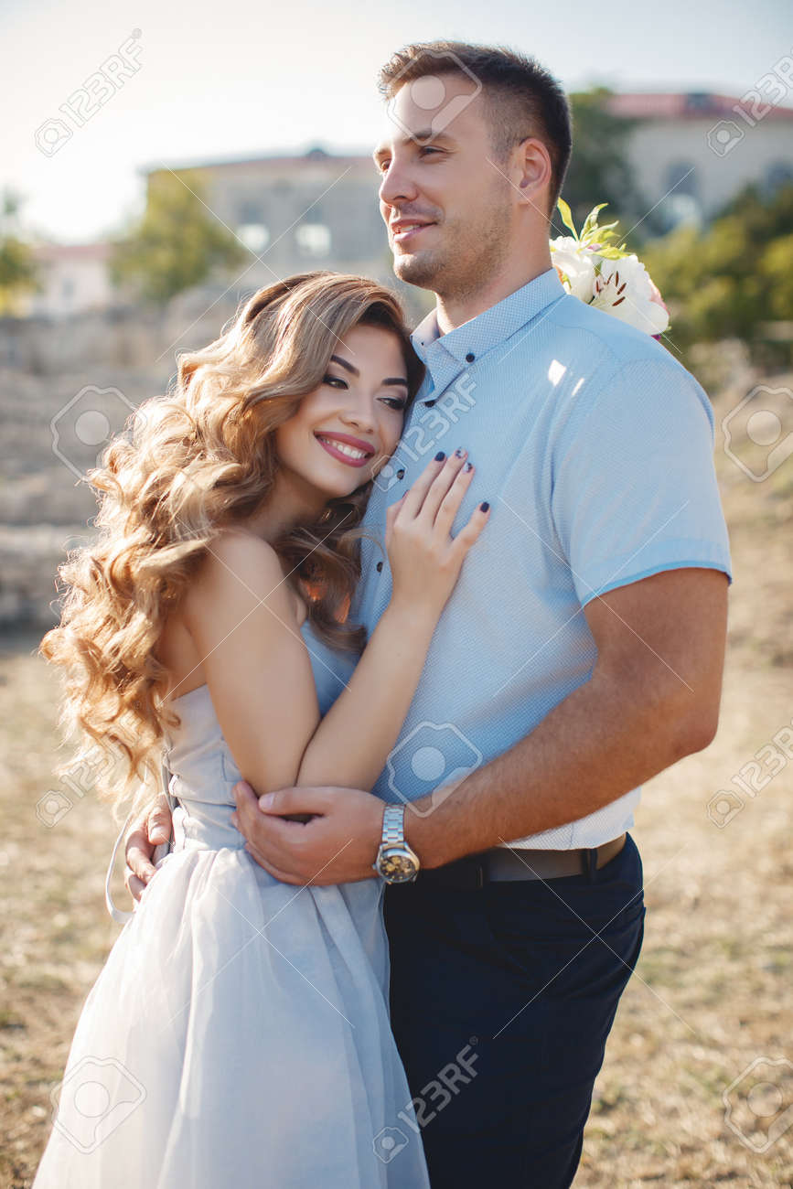 Una Pareja De Jóvenes Enamorados, Novios, En Su Boda Ropa, De Pie Abrazándose En El Parque De Verano Contra El Telón De Fondo De La Arquitectura De Piedra Antigua En Las Manos