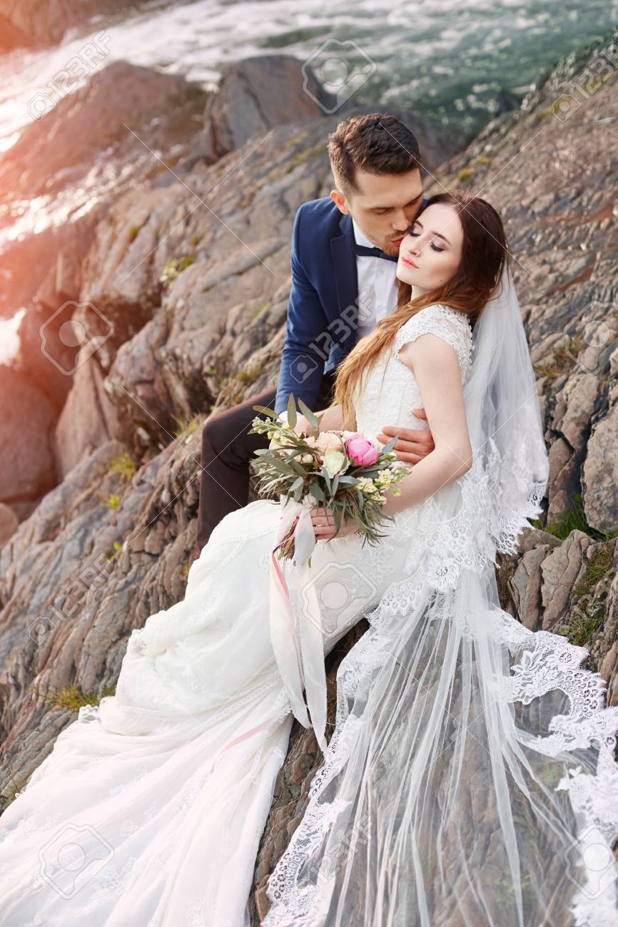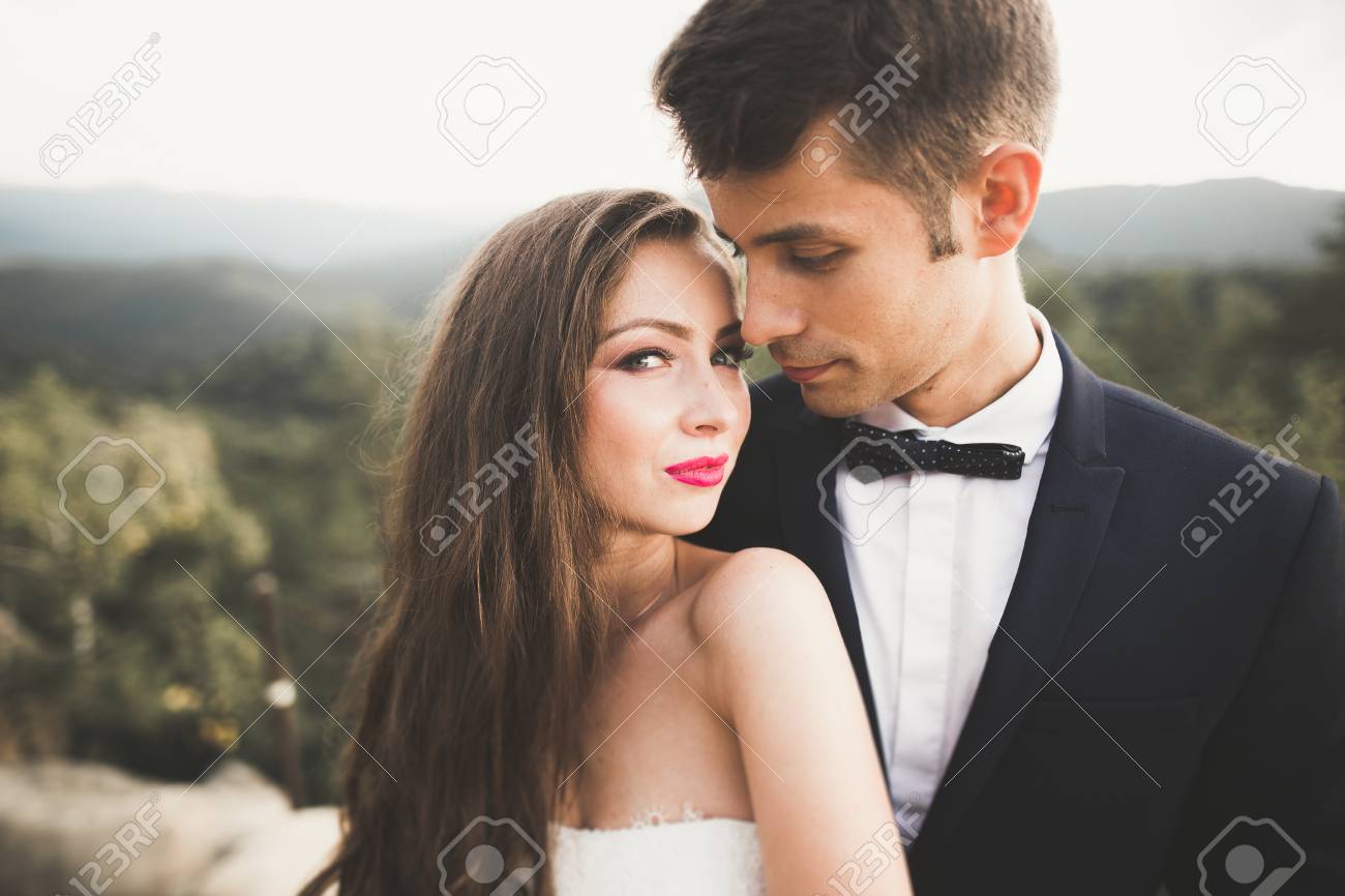 Hermosa Pareja De Novios, Novios Enamorados En El Fondo De Las Montañas Fotos, retratos, imágenes y fotografía de archivo libres de derecho. Image 86963932