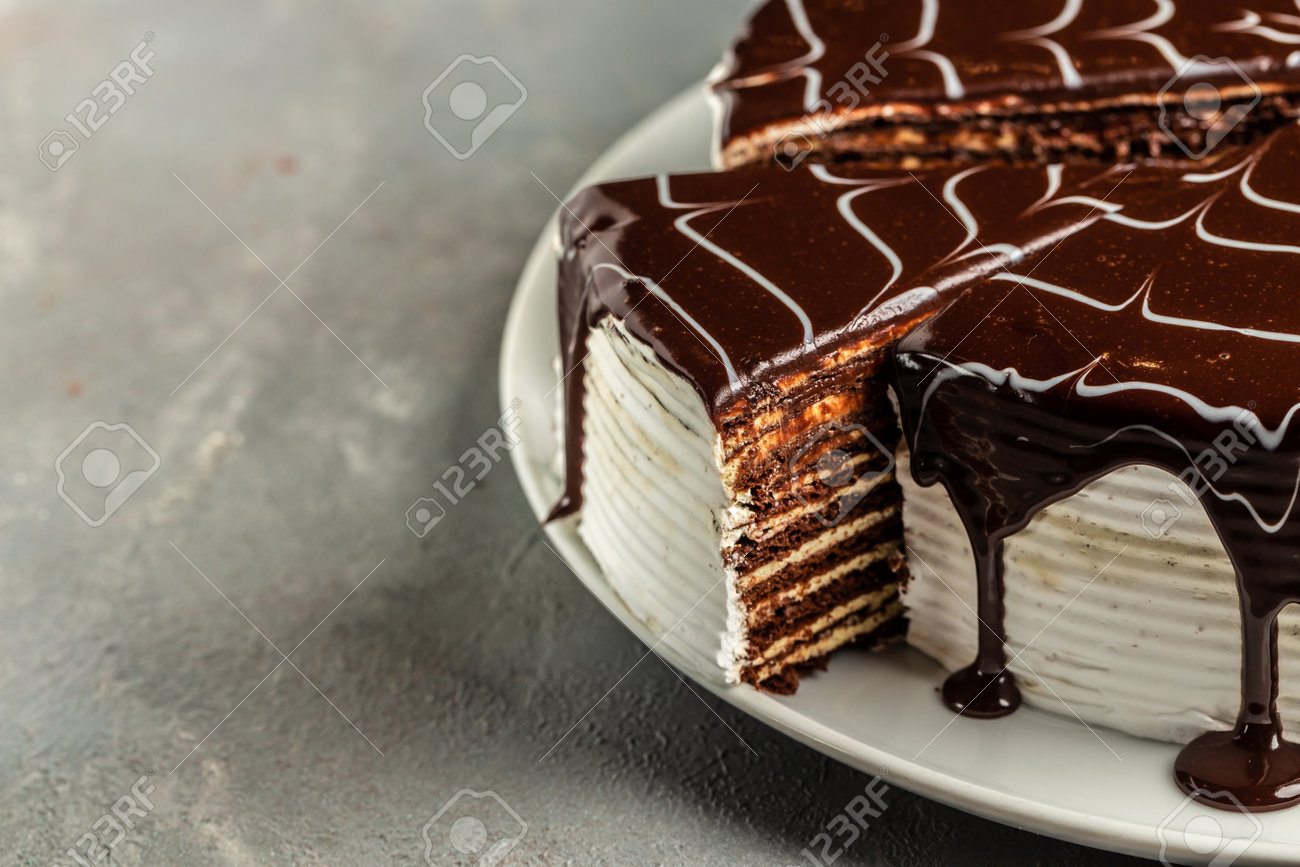 Delicioso Pastel De Chocolate Con Pradera Deliciosa. Fondo De La Receta. Cerrar. Tarta De Chocolate Por Capas Imagen de archivo - Imagen de derretido, delicioso: 250009483