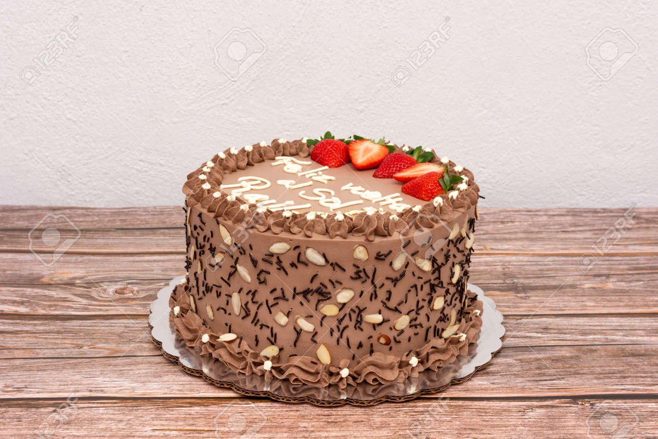 Tarta De Chocolate Decorada Con Fresas. Delicioso Pastel De Chocolate Casero Sobre Mesa De Madera. Fotos, retratos, imágenes y fotografía de archivo libres de derecho. Image 187314263