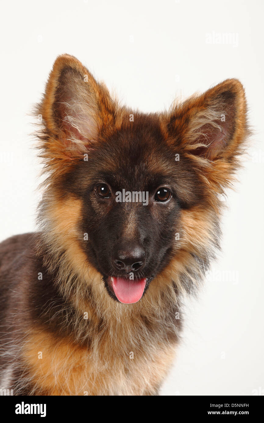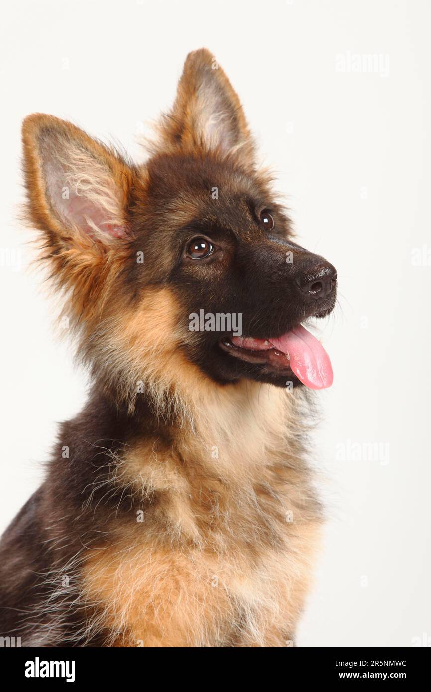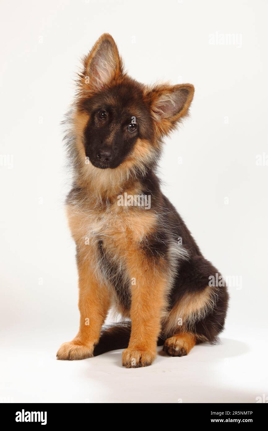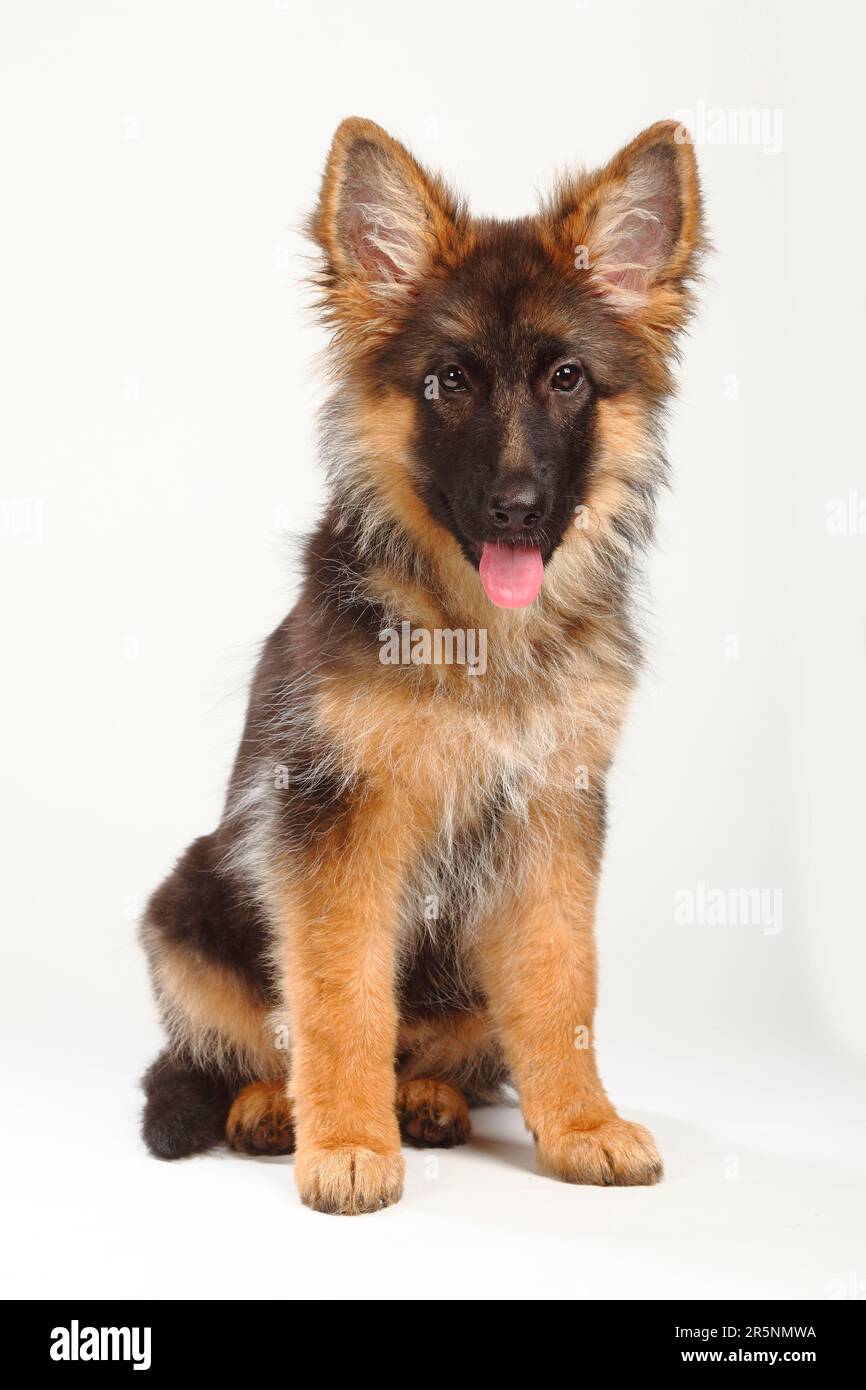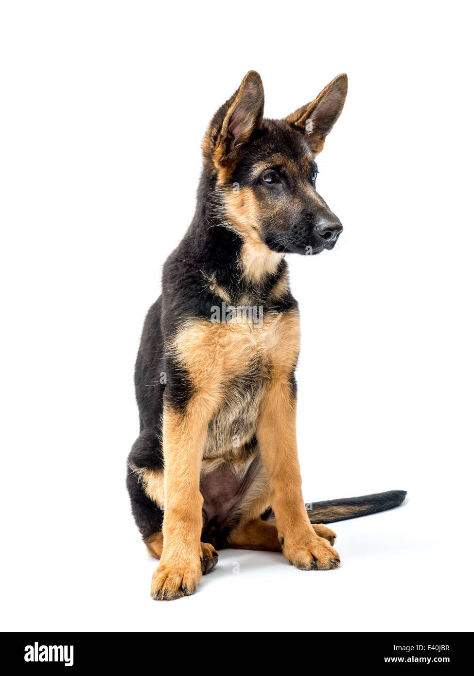 Cachorro de pastor alemán, de 4 meses de edad, sentado delante de un fondo blanco Fotografía de stock - Alamy