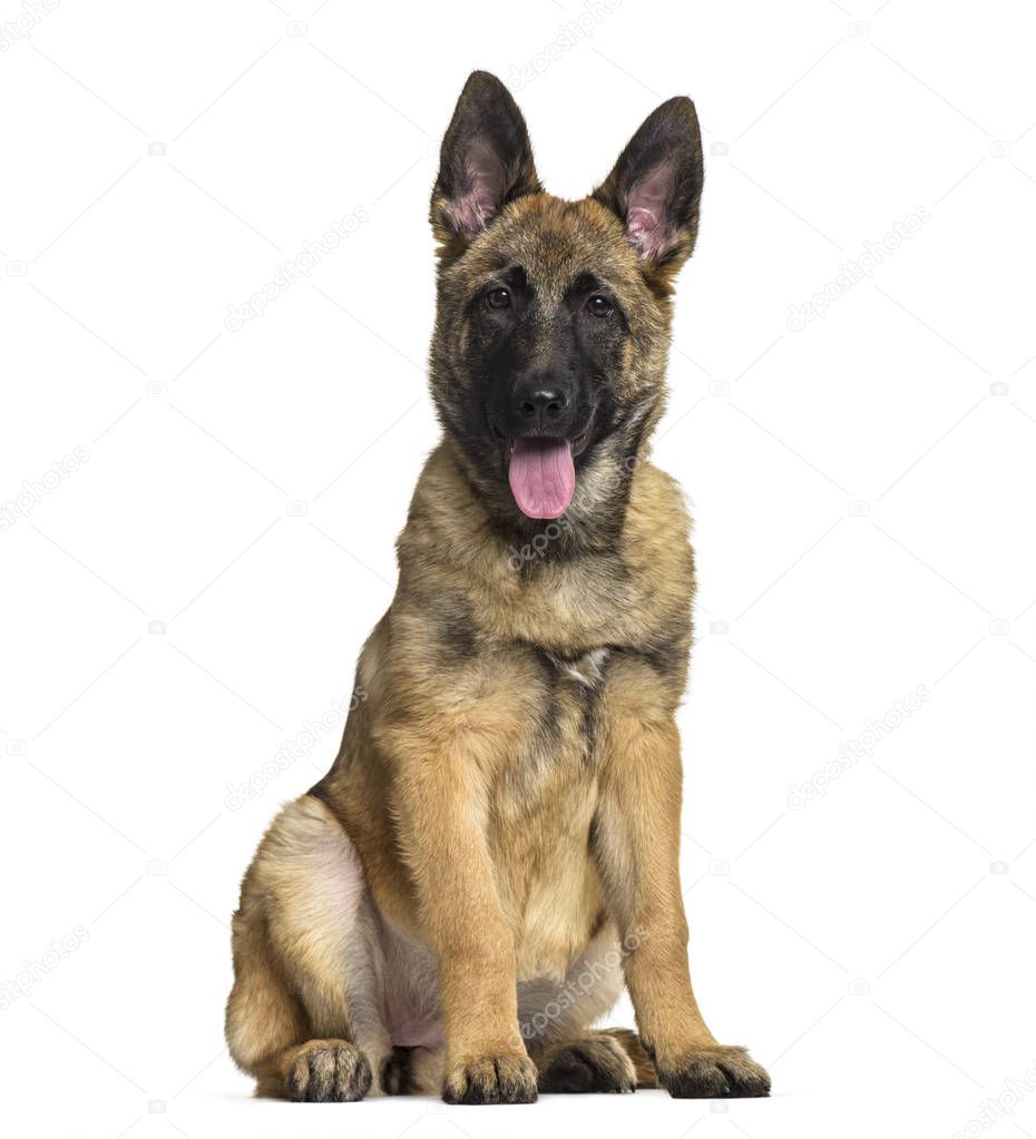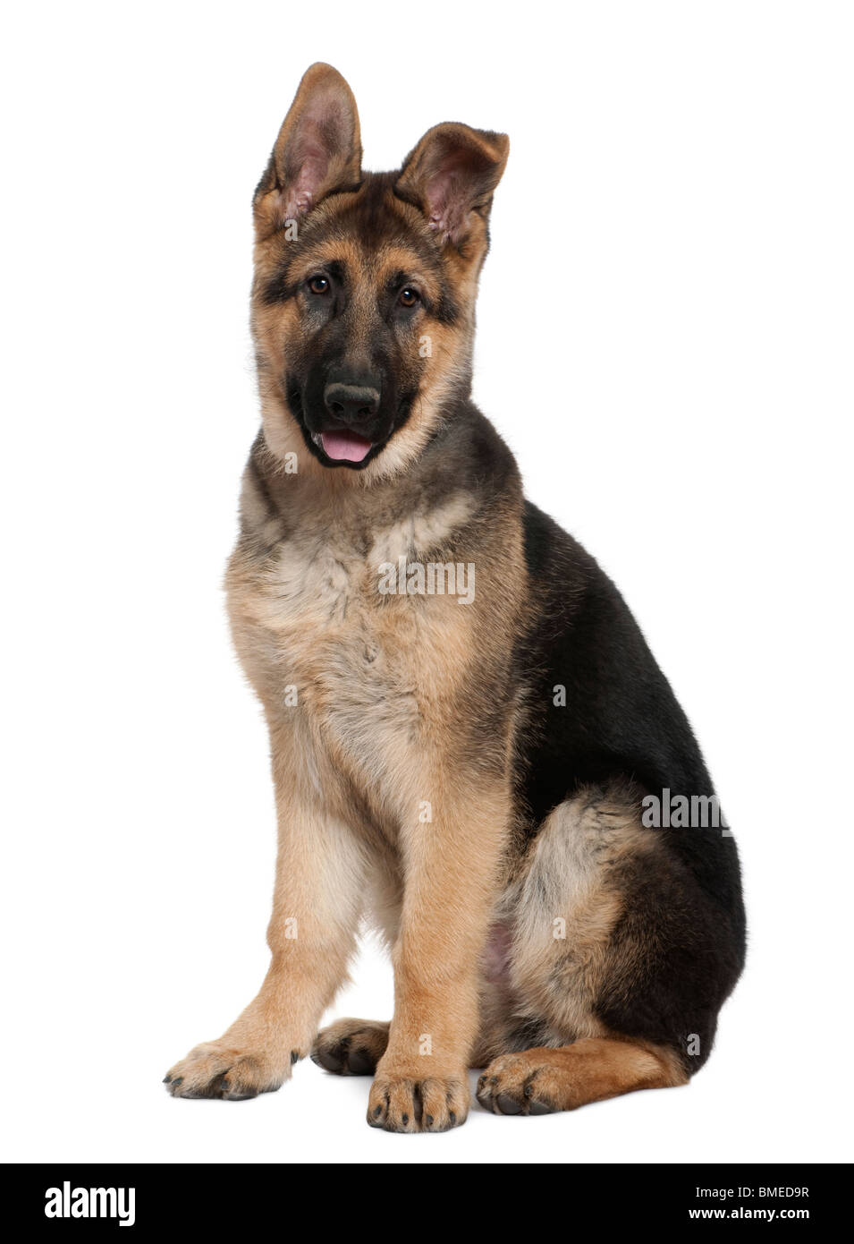 Cachorro de perro Pastor Alemán sentado, de 4 meses de edad, aislado en blanco Fotografía de stock - Alamy