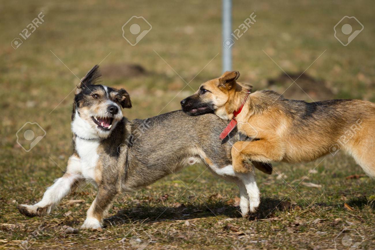 Dos Perros De Caza Silvestre En Un Parque Para Perros, Que Es Aa Cachorro De Pastor Alemán La Otra Mezcla De Un Perro Salchicha Terrier Fotos, retratos, imágenes y fotografía de archivo