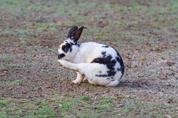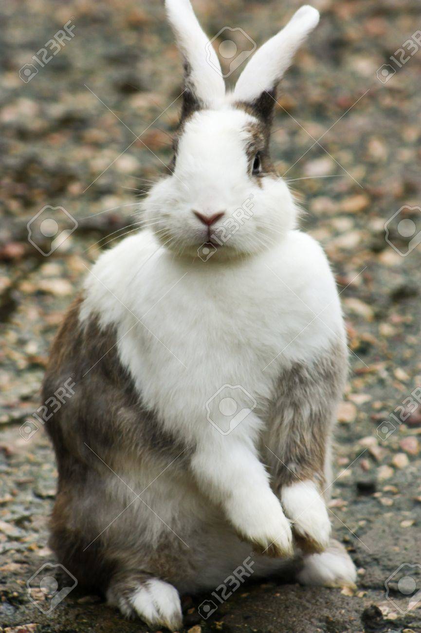 Marrón Y Blanco Conejo De Pie En El Suelo Del Parque Fotos, retratos, imágenes y fotografía de archivo libres de derecho. Image 14342678