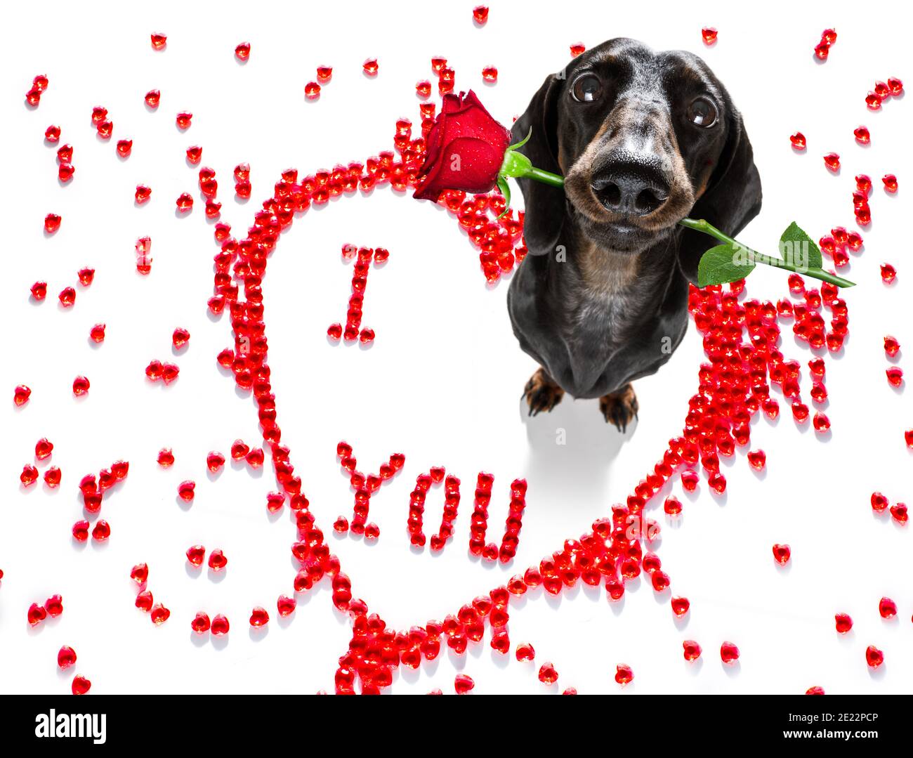 Salchicha dachshund perro en valentines amor forma corazón con yo te quiero firmar como fondo aislado en blanco Fotografía de stock - Alamy