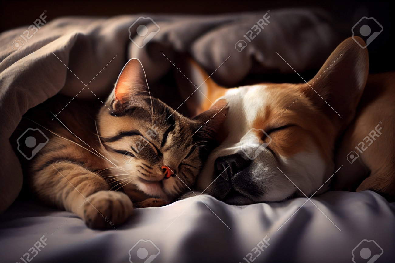 Lindo Perro Y Gato Durmiendo Juntos En La Cama Bajo Una ...