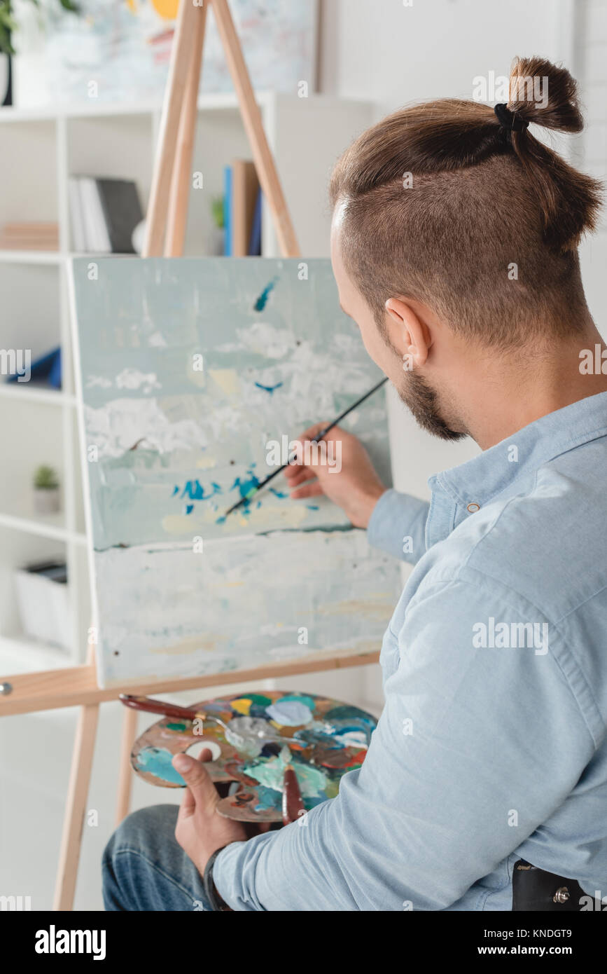 Hombre artista pintando cuadro en caballete, hobby, estudio de arte, concepto de clases de arte | Vector Premium