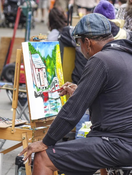 Una persona pintando un cuadro en una calle. | Foto Premium
