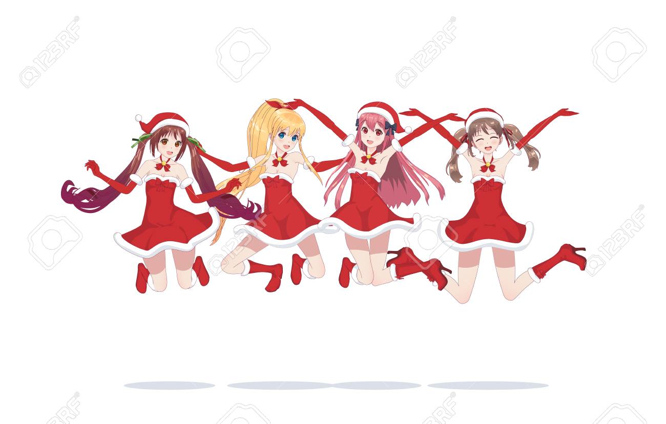 Alegres Chicas Anime Manga Vestidas Como Santa Claus, Rebota. Saltó En Un Salto. Con Gorra De Invierno Gorro De Papá Noel Ilustraciones svg, vectoriales, clip art vectorizado libre de derechos. Image 110895507
