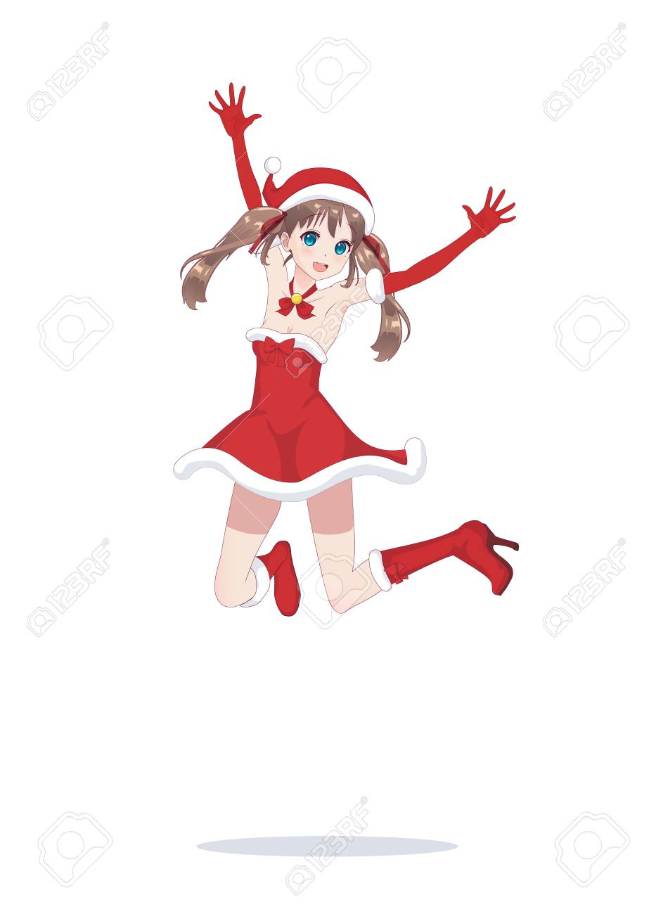 Alegre Chica De Anime Manga Vestida Como Santa Claus, Rebota. Dio Un Salto. Mujer Feliz Divirtiéndose Ilustraciones svg, vectoriales, clip art vectorizado libre de derechos. Image 111435324
