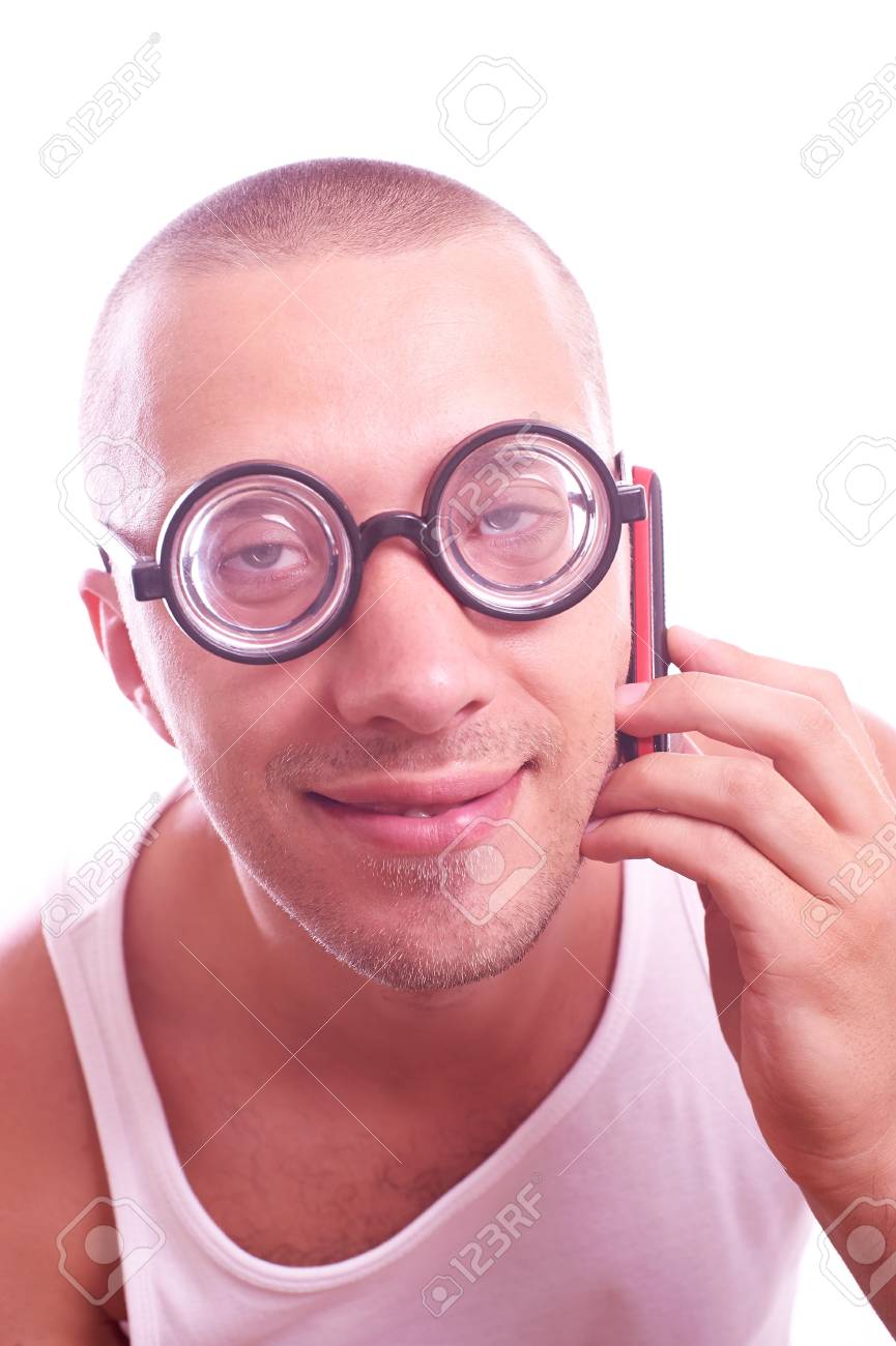 Retrato De Un Nerd Raro Satisfecho En Las Lentes Que Llama Por El ...