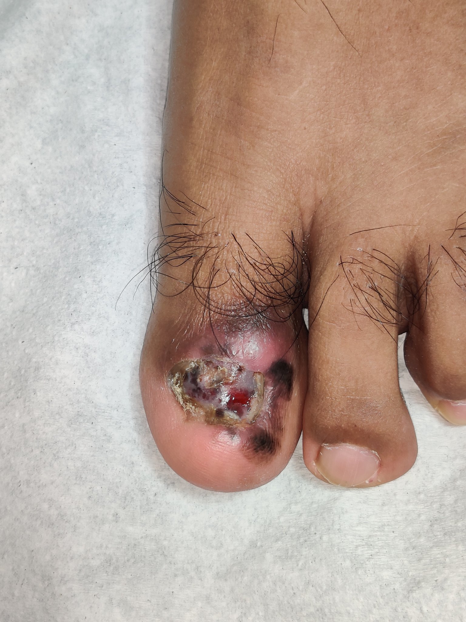 Figure, Clinical photo of an ulcerated acral lentiginous melanoma on the dorsal aspect of a toe.] - StatPearls - NCBI Bookshelf