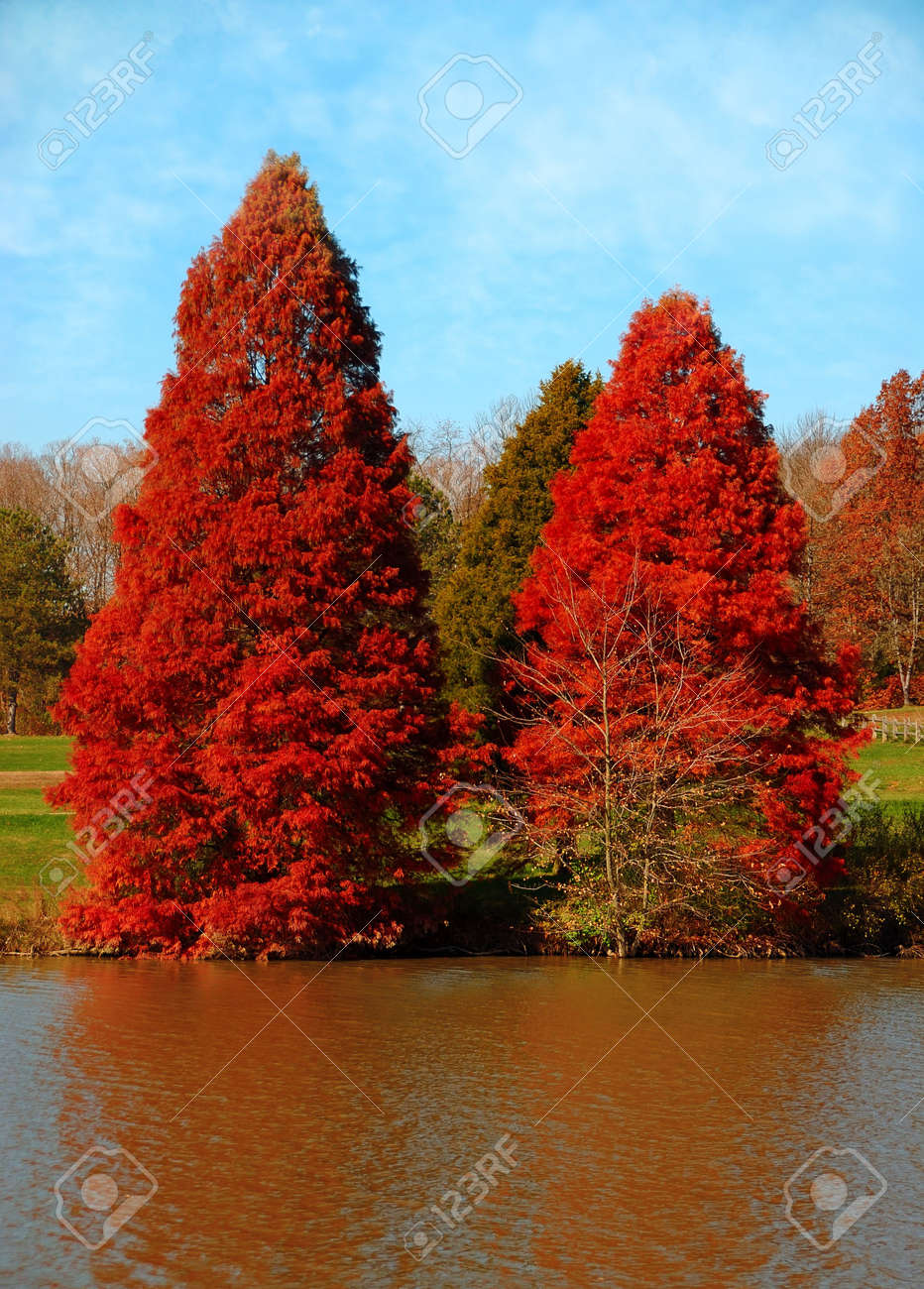 Red Pinos - Dos Árboles De Pino Rojo Con Agujas Sentarse En La Orilla Del Río En Otoño. Fotos, retratos, imágenes y fotografía de archivo libres de derecho. Image 598926