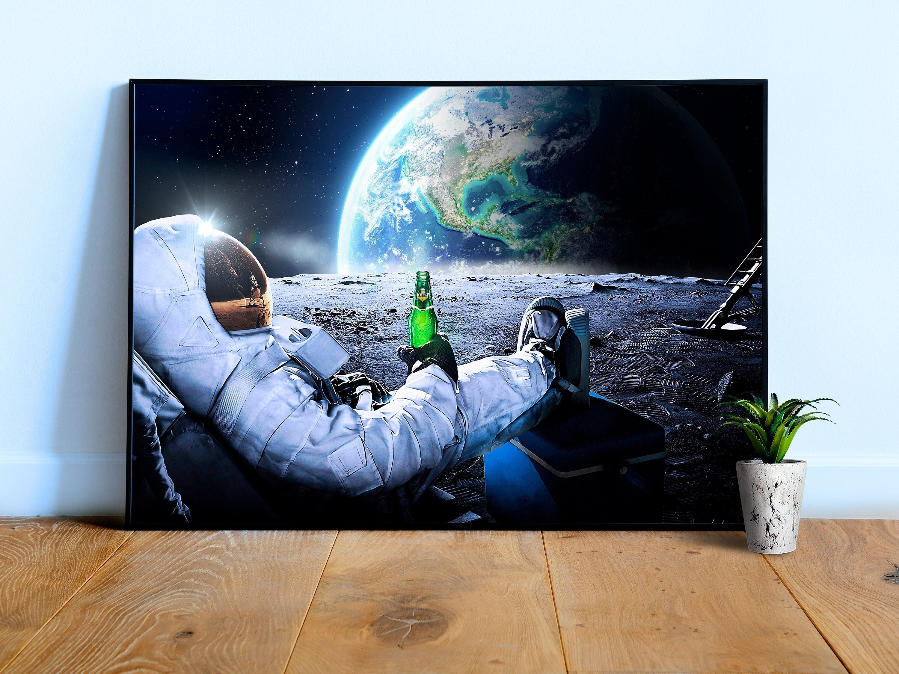 Guying Art Astronauta Beber Cerveza en la Luna Paisaje Lienzo Pintura Impreso Arte de la Pared Espacio Hombre Imagen para Sala de Estar Quadros Decoración 90x180cm (35x71in) con marco : Amazon.es: Hogar