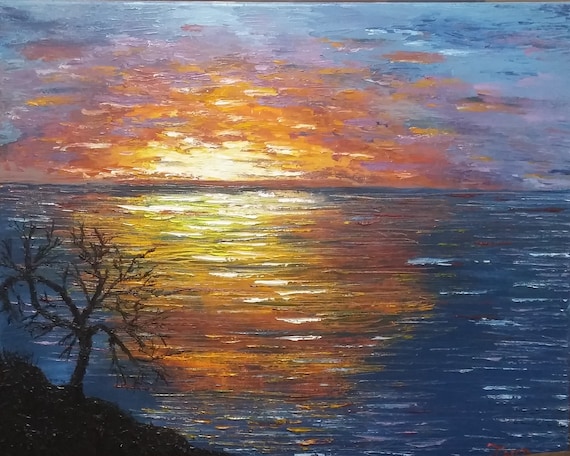 Noche solitaria por el lago abstracto paisaje óleo lago árbol de agua atardecer sol cielo rojo naranja azul oscuro noche arte pintura reflejos de ...