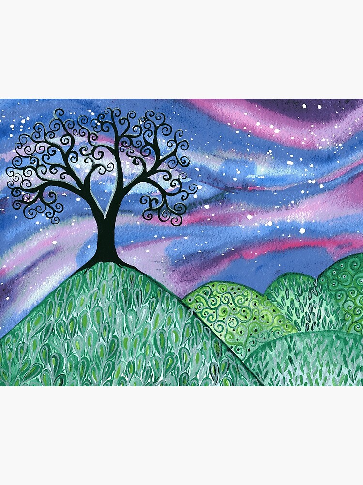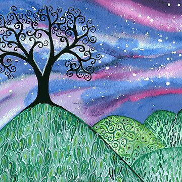 Una noche solitaria: original acuarela brillante y caprichosa de un árbol arremolinado y un cielo estrellado de klbaileyart | Lámina rígida