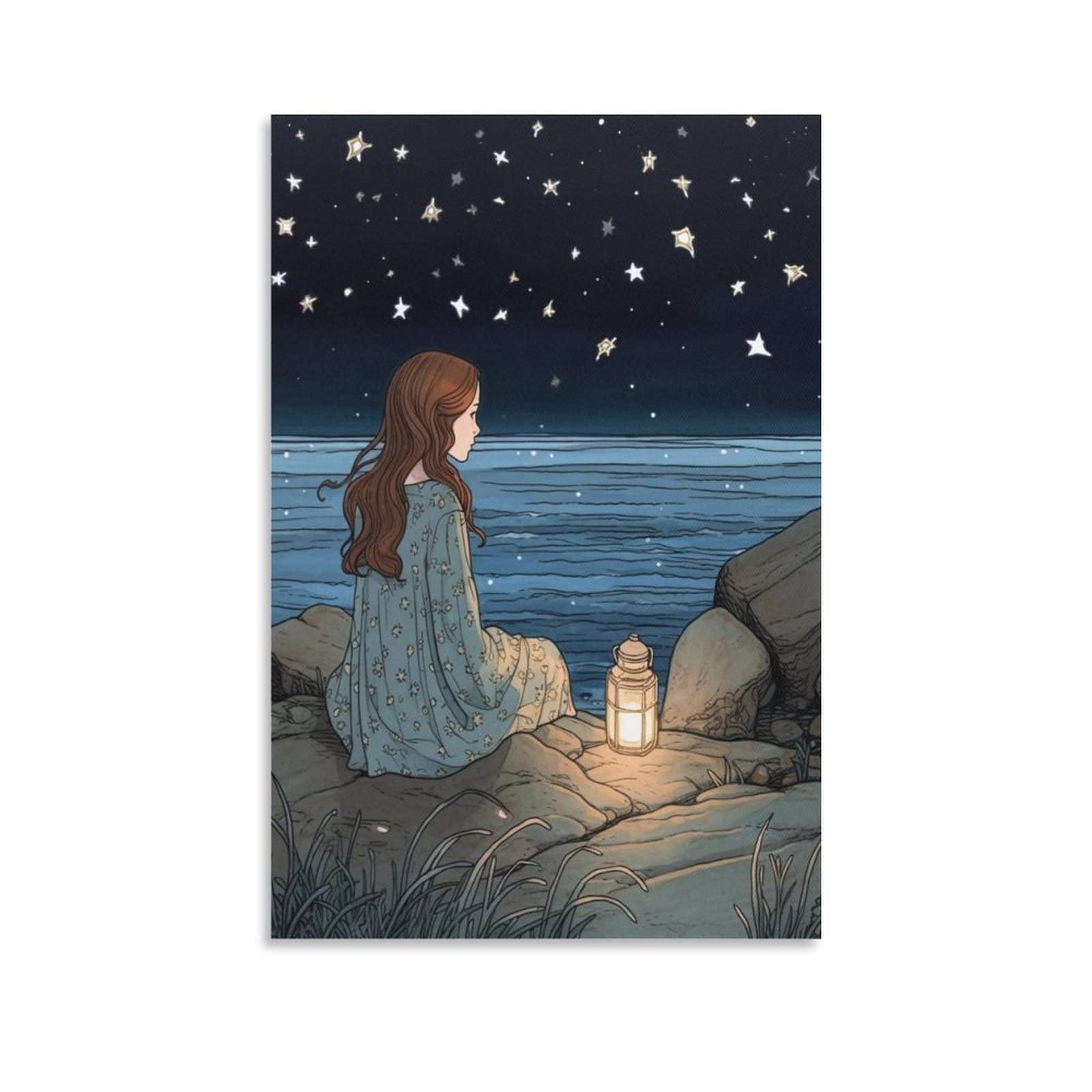 KONIEE Póster de pintura al óleo de mujer solitaria mirando el mar ...