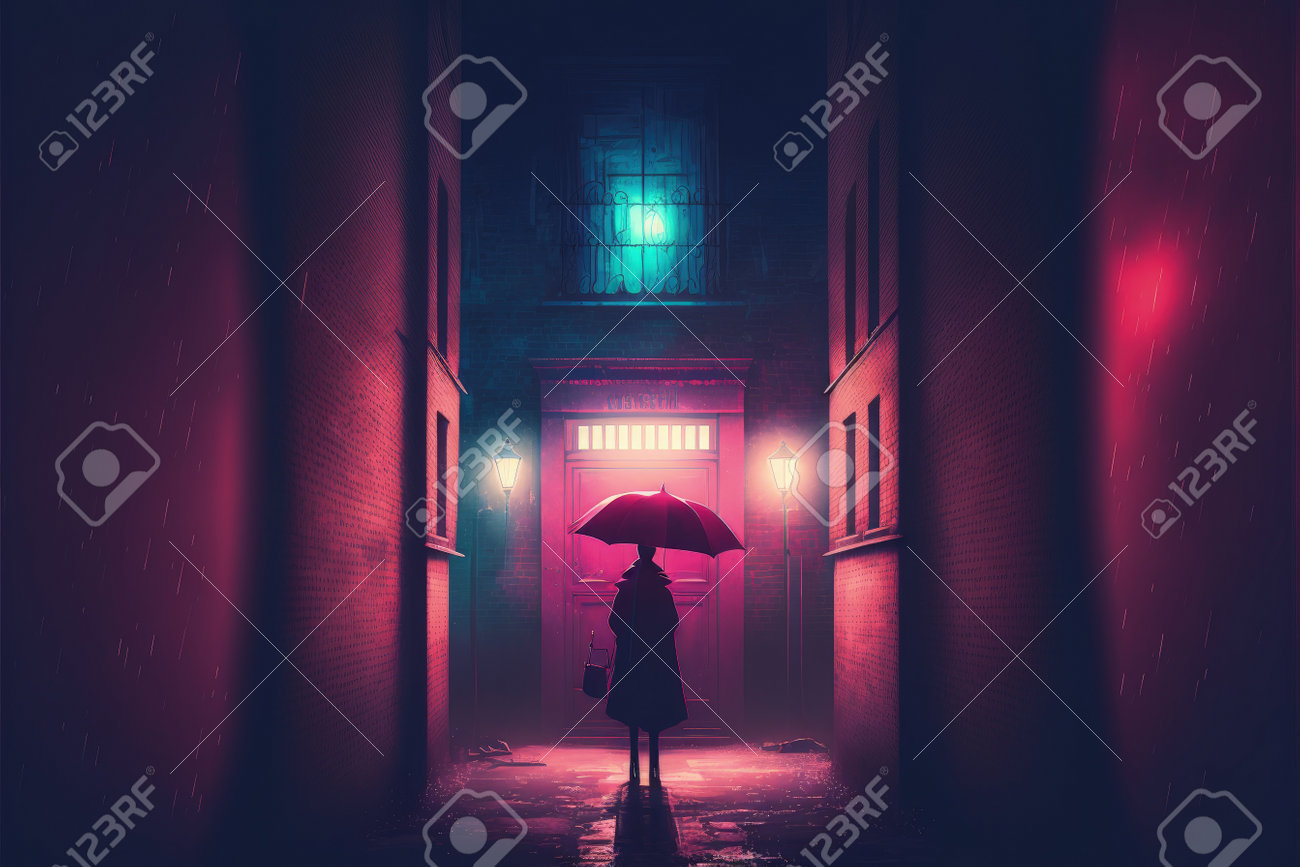 Mujer solitaria con sombrilla en night city,ilustración pintura ...