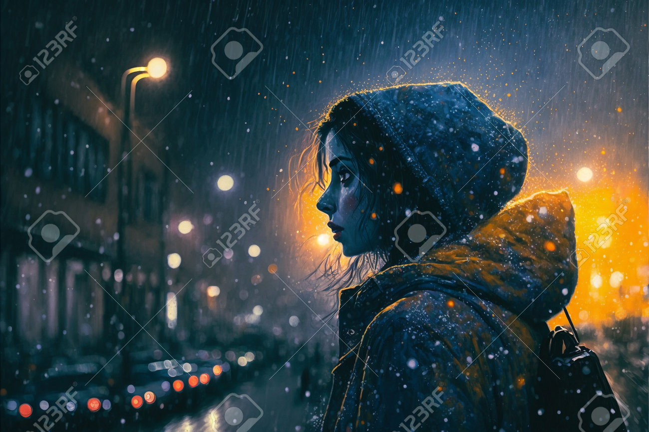 Chica Solitaria En La Nieve Que Cae Por La Noche Con Luces Bokeh ...