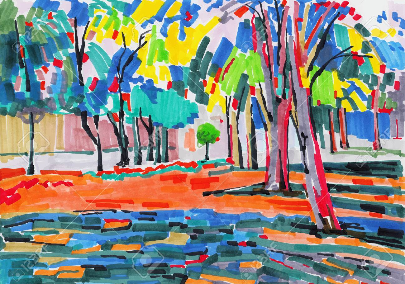 Pintura Original Del Marcador Inusual Paisaje De Árboles, Bellas ...
