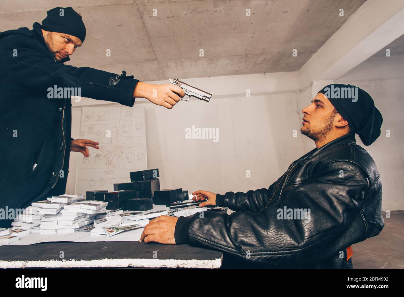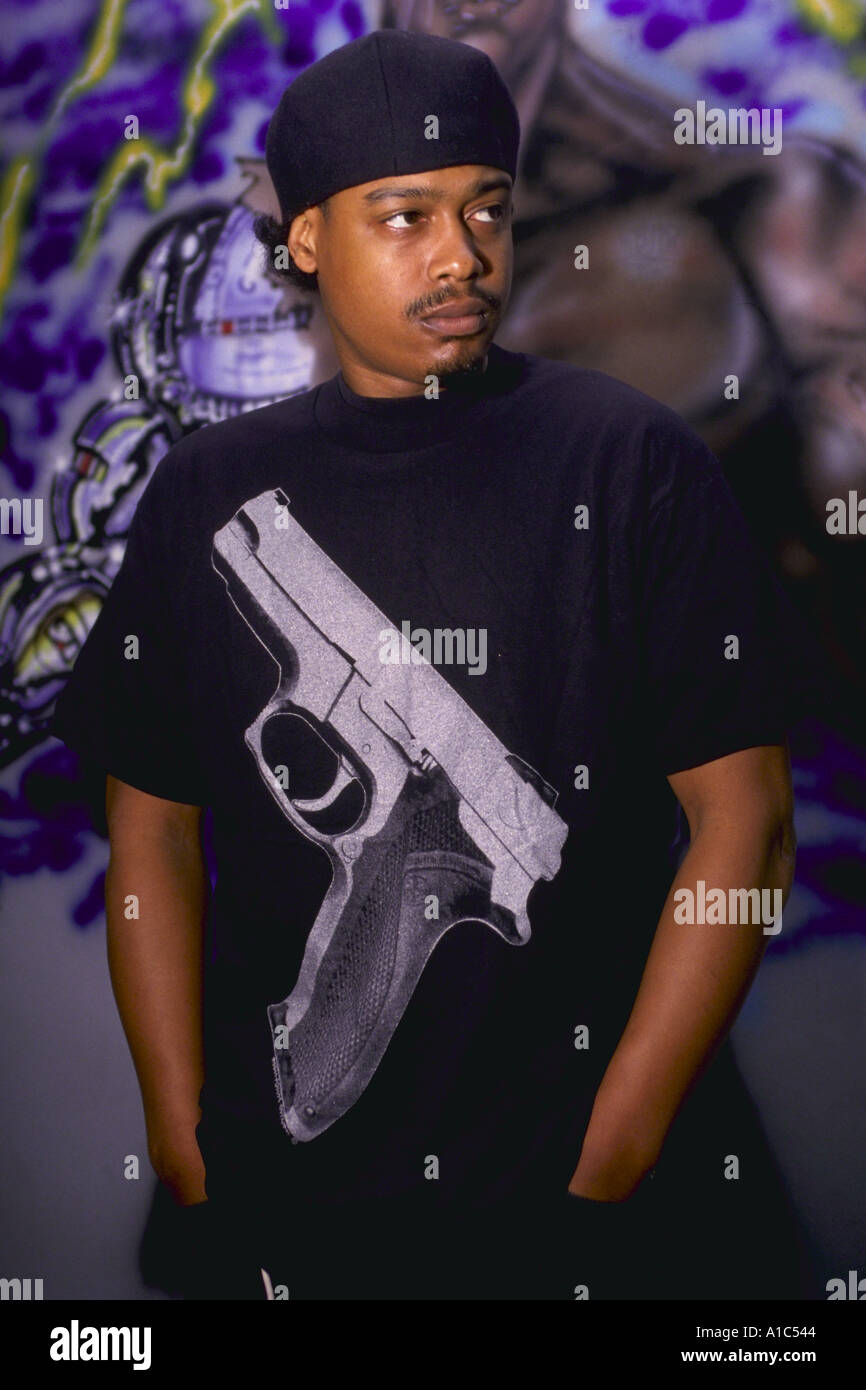 Artista e t shirt designer Marco Dee pone indossando una delle sue magliette che mostra una pistola a mano a Washington DC modello rilasciato Foto stock - Alamy