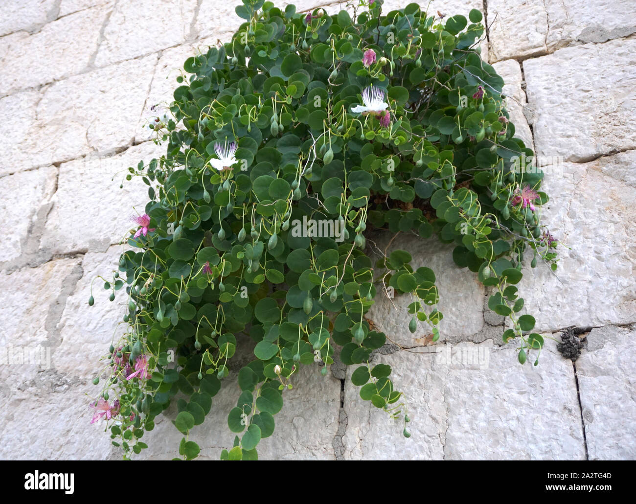 Planta Capparis spinosa verde o alcaparras sobre la pared de piedra Fotografía de stock - Alamy