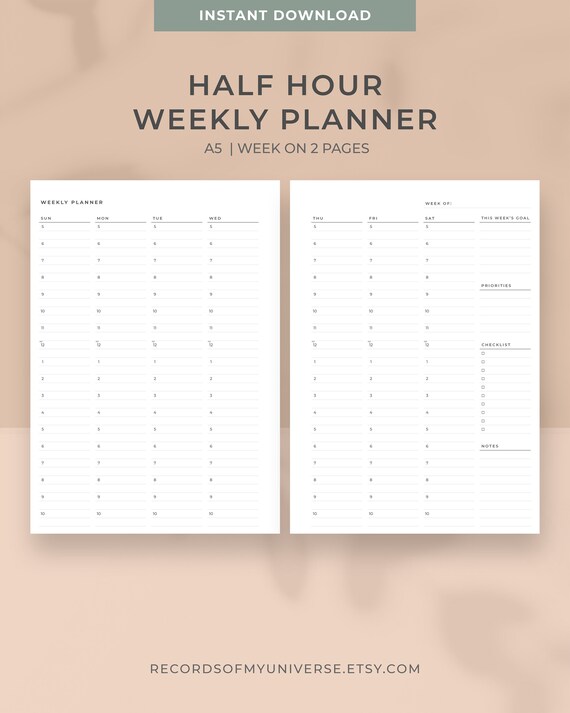 A5 Plantilla de planificador de horario semanal de media hora Imprimible / Semana en 2 páginas / Lun &Sun start / 30 min interval weekly planner / - Etsy España