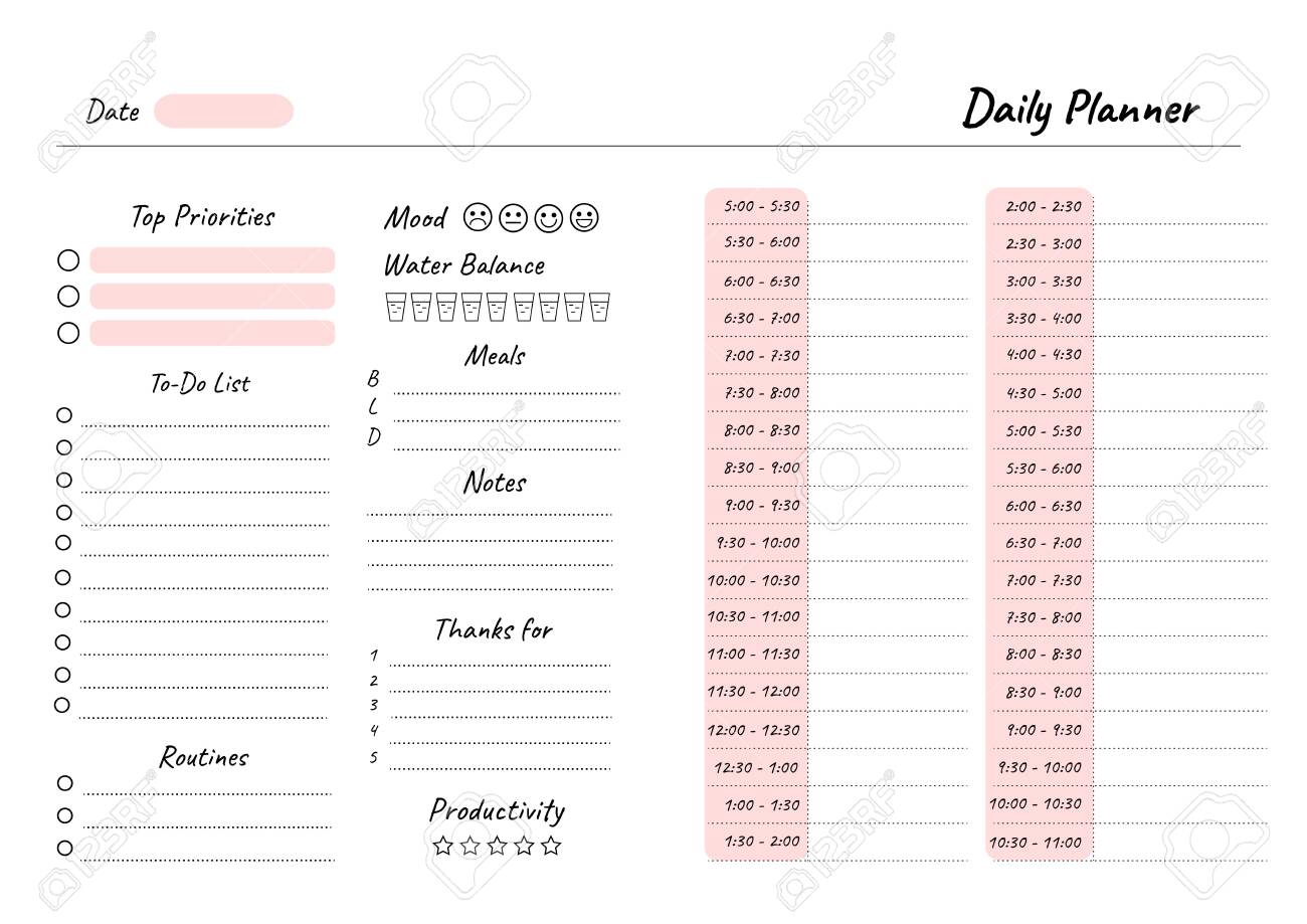 Vector De Plantilla De Planificador Diario Imprimible. Formato De Letra De Bloc De Notas Blanco En Blanco Ilustración del Vector - Ilustración de programa, extracto: 248102885