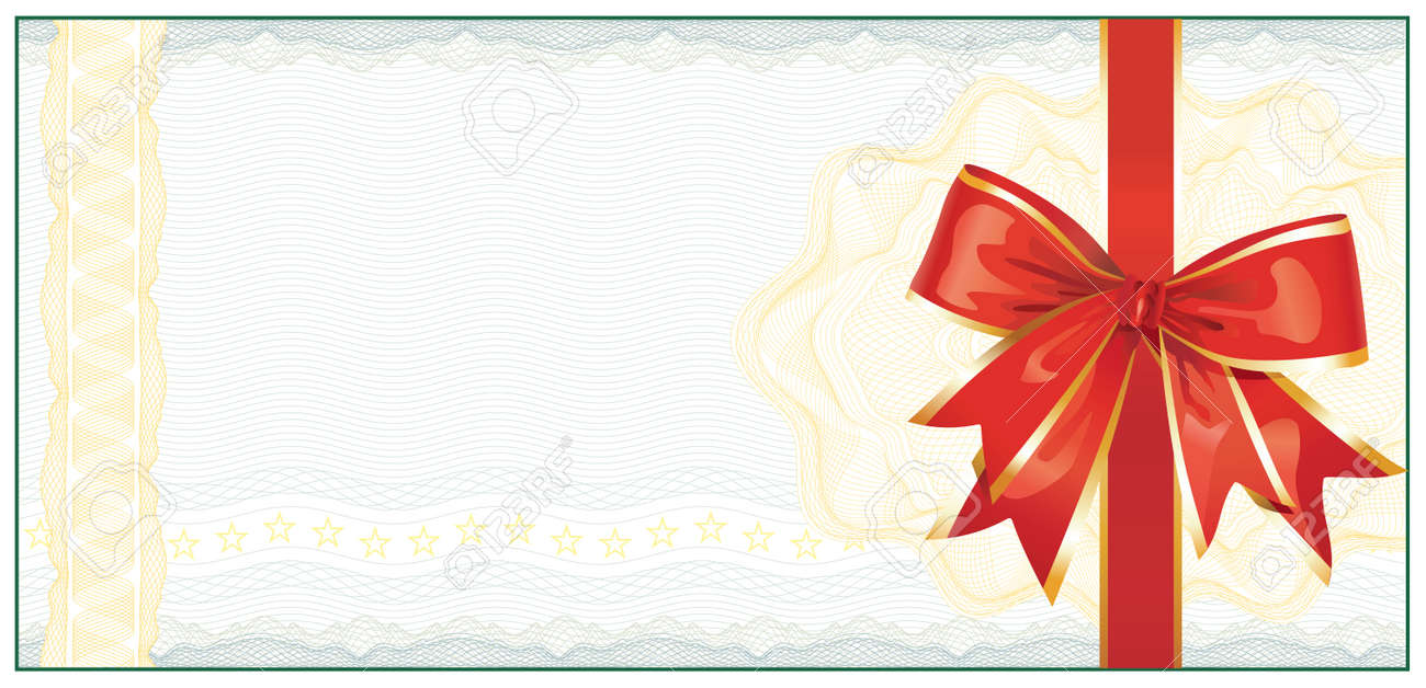 Plantilla De Certificado De Regalo (diseño De Vale De Regalo, Plantilla De Cupón). Ejemplo De Diseño De Tarjeta De Regalo Con Lazo Dorado, Cinta Y Borde De Marco Floral. Patrón De Fondo