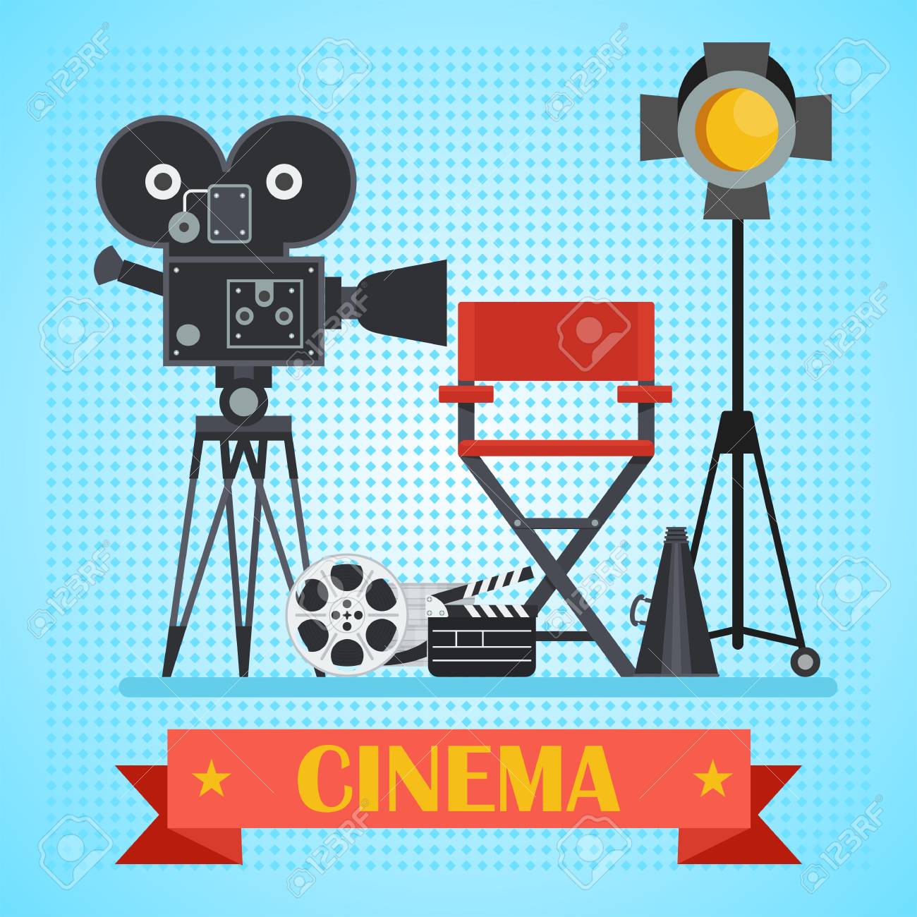 Silla Director Y Reflector, Película, Badajo. Cartel De Película De Plantilla Para Cine. Concepto Del Cine. Ilustración De Dibujos Animados De Vector Plano. Objetos Aislados En Un Fondo Blanco. Ilustraciones svg, vectoriales,