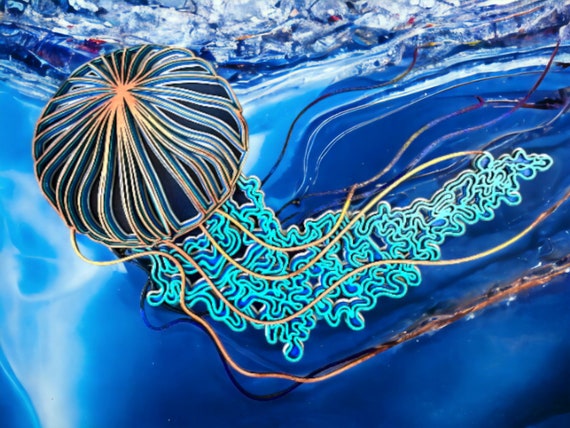 Arte de pared de medusas de ortiga marina del Pacífico pintado a mano con detalle bioluminiscente que brilla en la oscuridad / jaleas de mar / 5 capas / madera cortada con láser - Etsy España