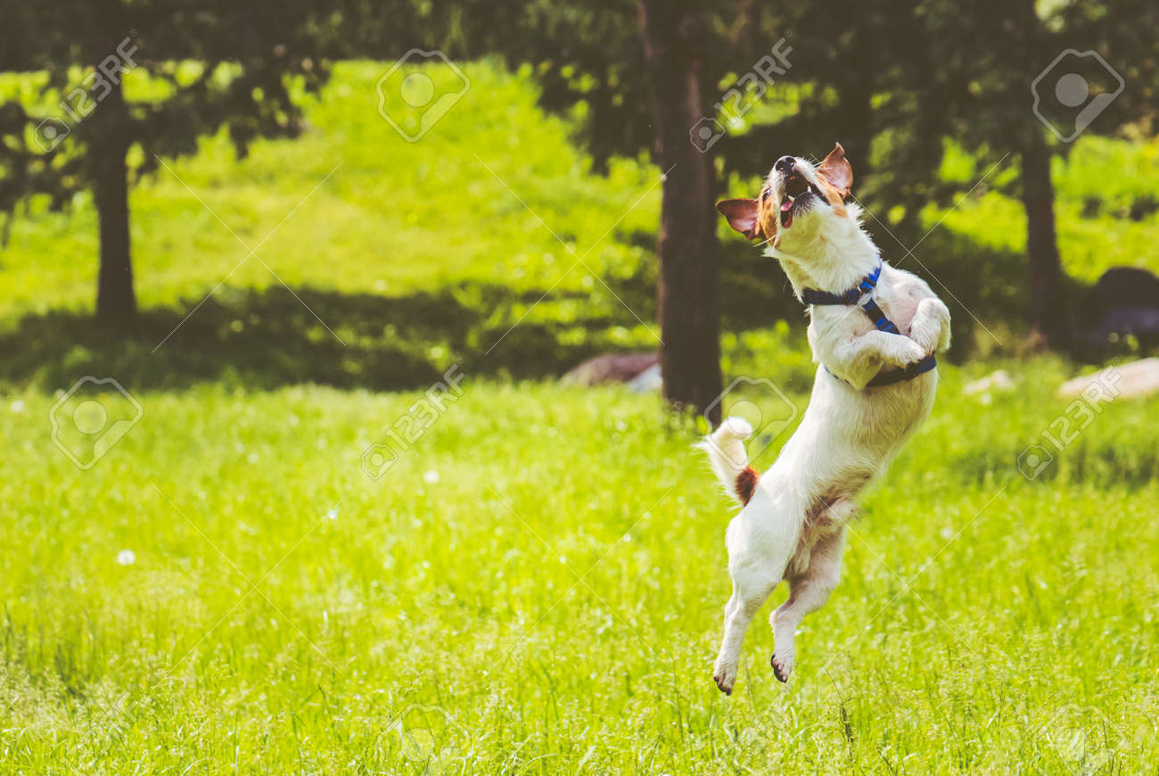 Perro Salta A La Acción Saltando En El Césped Del Parque En El Caluroso Día De Verano Fotos, retratos, imágenes y fotografía de archivo libres de derecho. Image 75669423