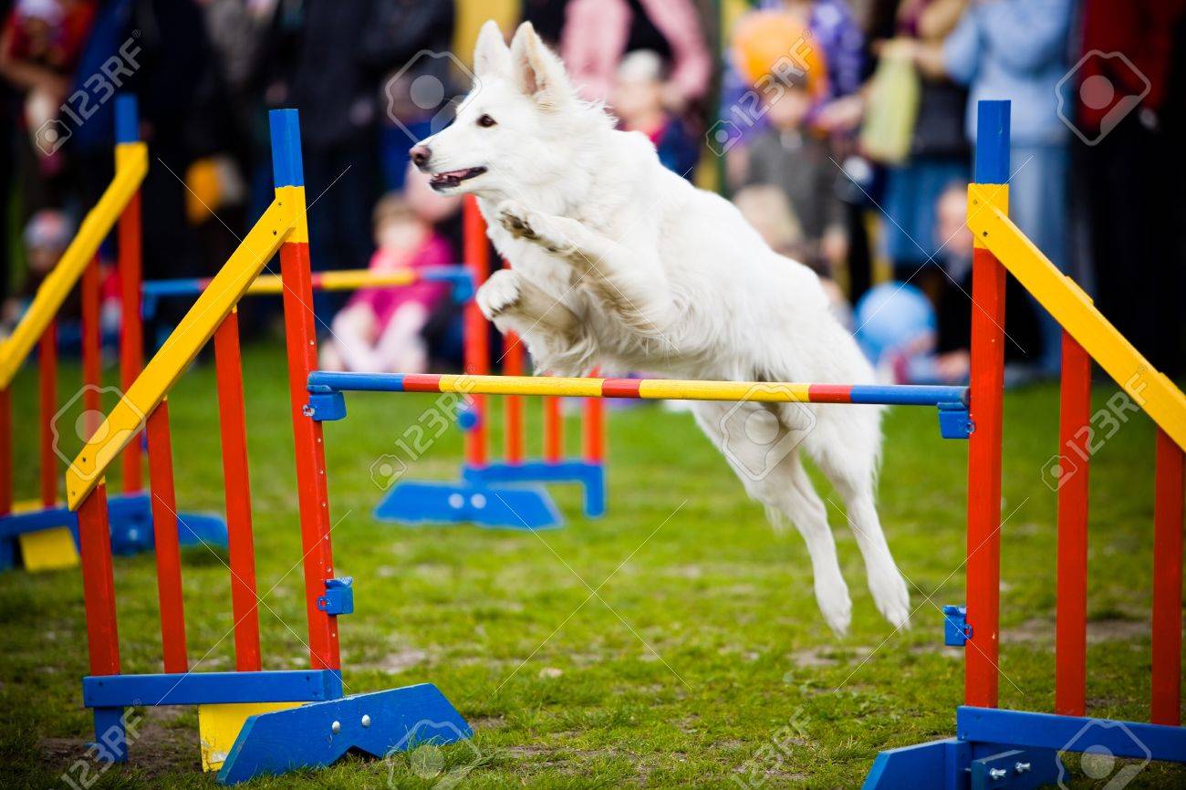 Perro saltando por encima de un obstáculo la barra durante la competencia de agilidad Fotografía de stock - Alamy