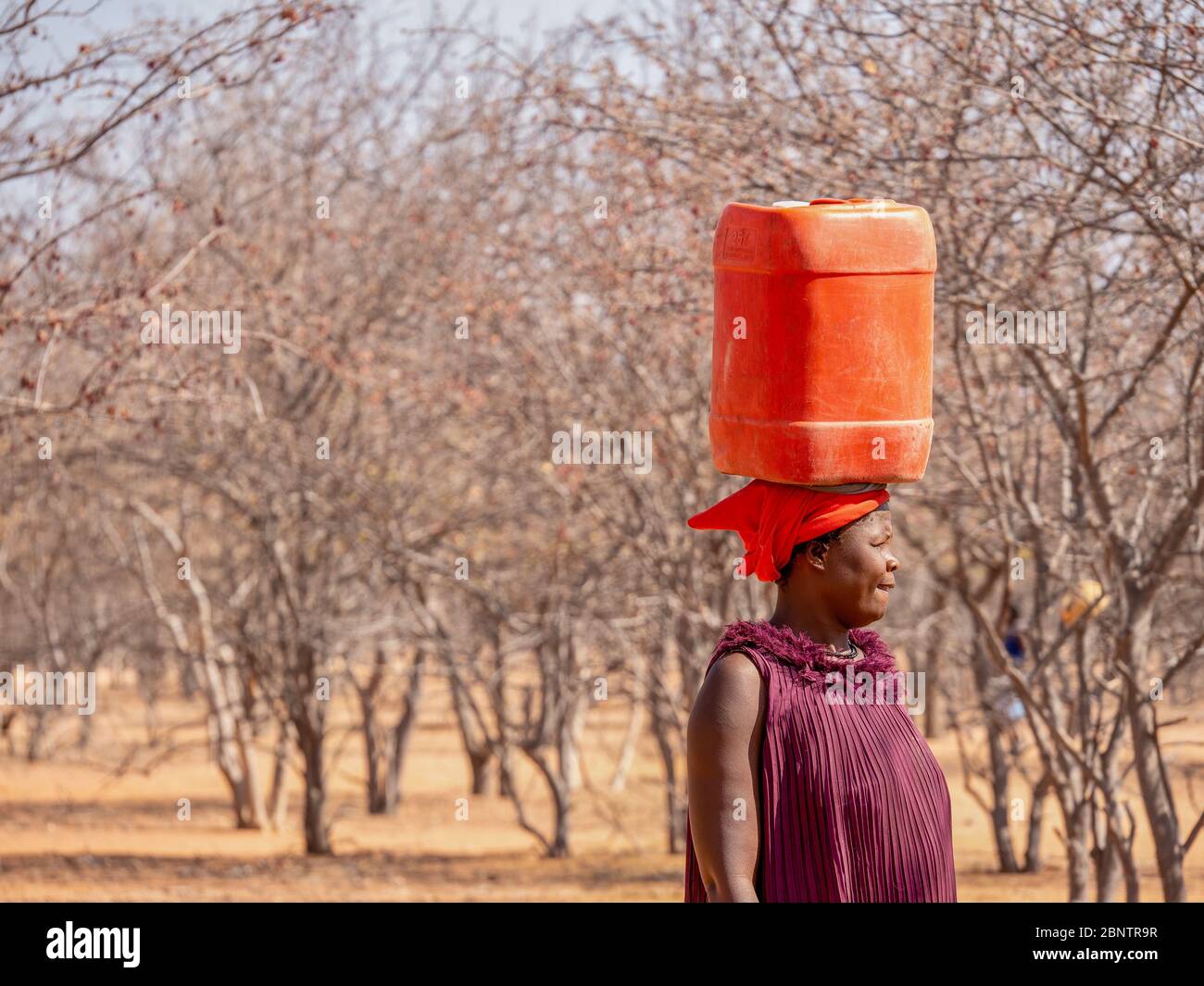 Namibia rural - 21 de agosto de 2016. Una mujer africana lleva una lata jerry de agua